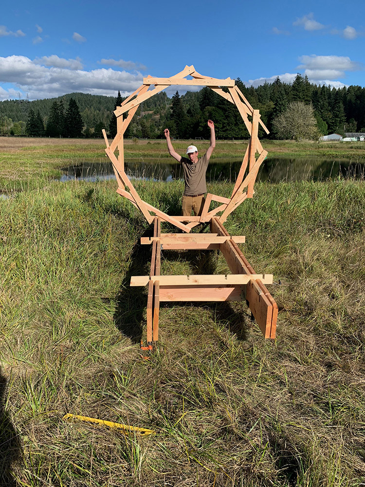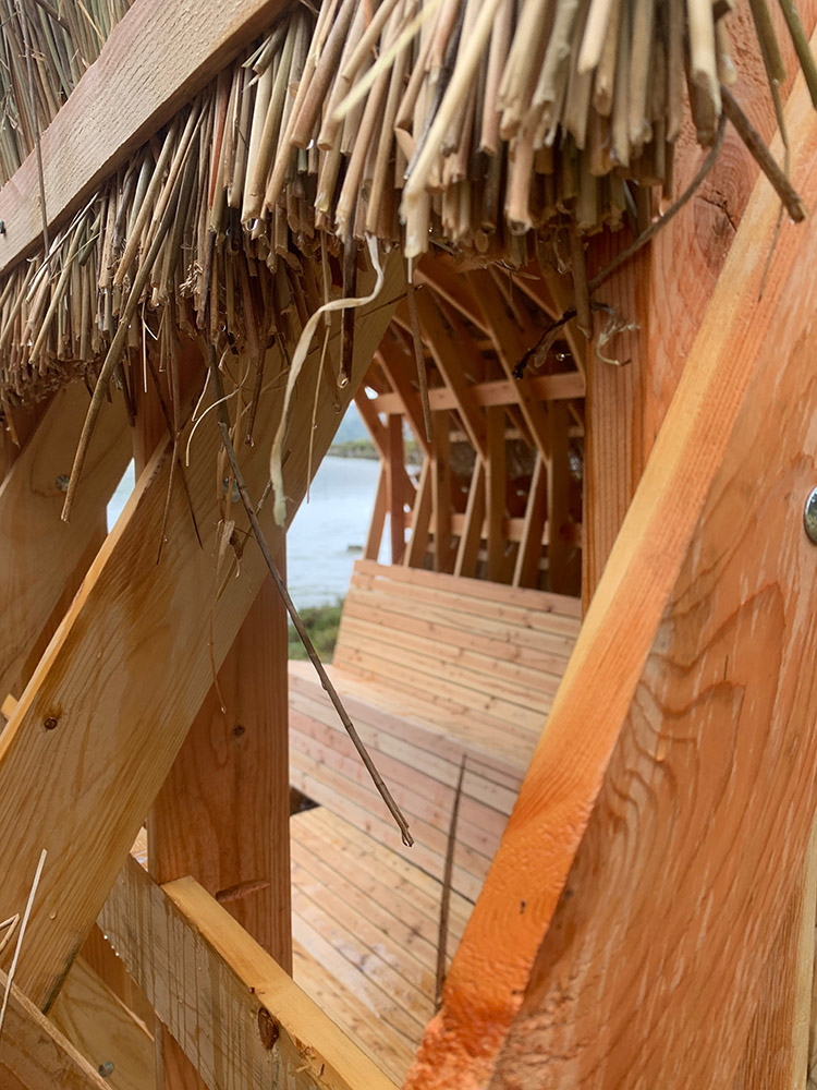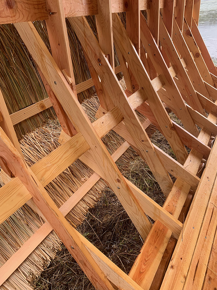 The design of the portals is meant to be a resistance to the pipeline, transforming the perception of these places and demonstrating the ecological value rather than the profit that can be made from it. The pavilion is made entirely of wood and has a circular shape