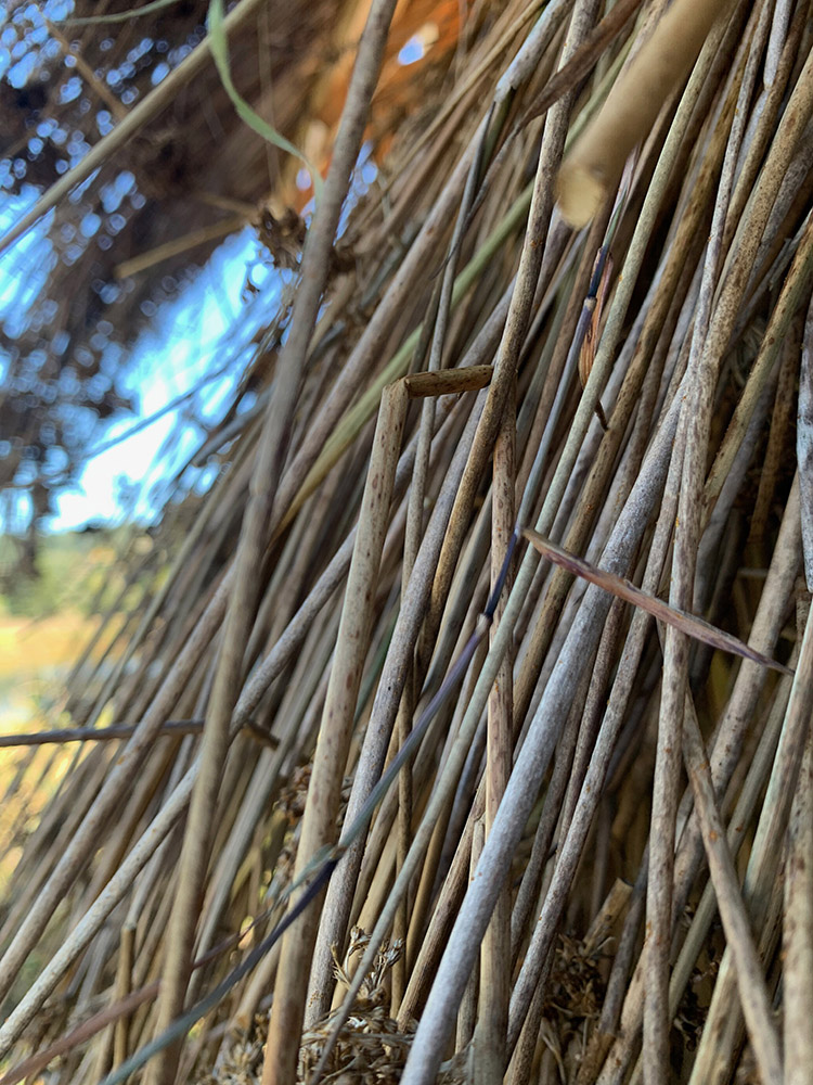 The cloth around the portal allows rainwater to fall on one side, providing shelter for humans as well. On the other side the thatch collects water and nutrients, creating a very active habitat for other species