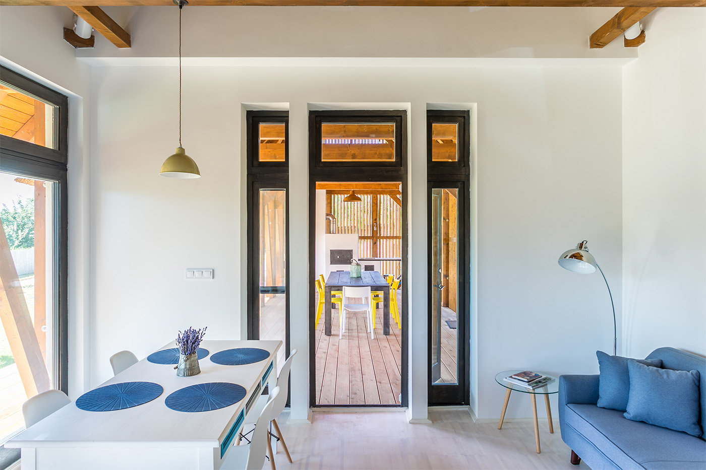 The structural elements are visible from the outside: pillars arranged in pairs, at a distance of 1.4 m from each other, between which you can see windows and transparent doors running along the entire facade. The numerous openings allow a considerable amount of natural light to enter the interior of the house, as well as a direct and constant connection between inside and outside, between the residents and the surrounding nature