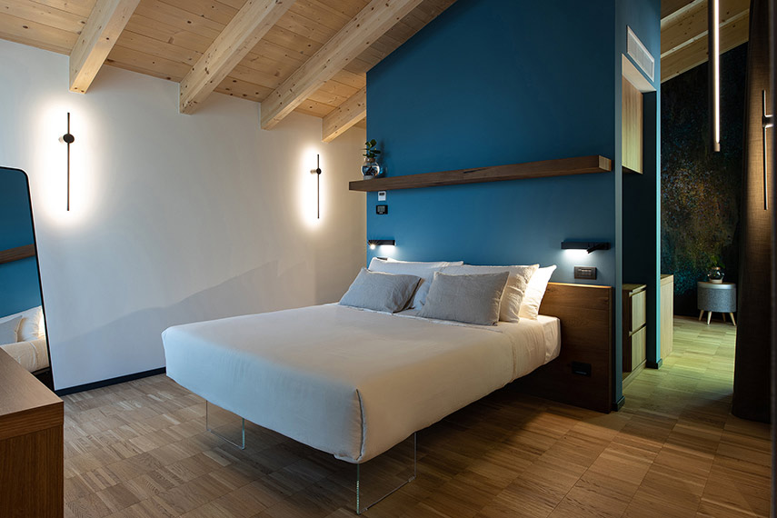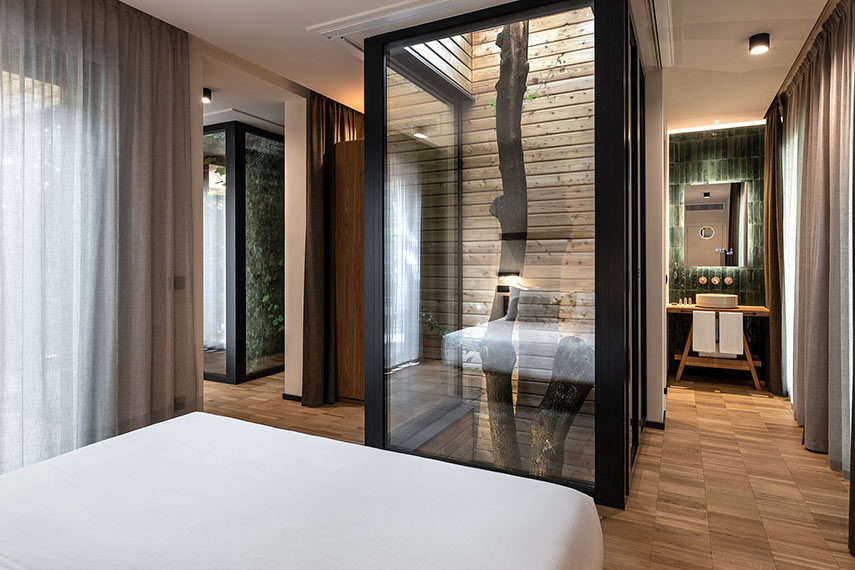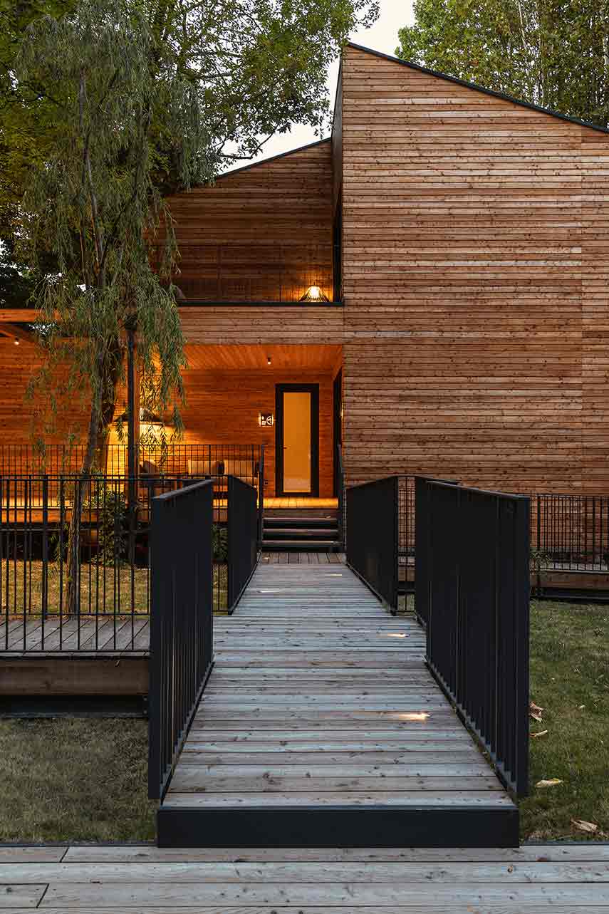 As part of the Terme Preistoriche Resort & Spa, the Green Lodges embody a zero-emission approach to hospitality. Designed by Studio Apostoli, four wooden stilted structures house seven suites, connected by a raised system of ramps, walkways, and accessible terraces. Additionally, a historically preserved villa represents the eighth and most extensive offering in this visionary venture. The designed structures and outdoor spaces are supported on 160 micro piles, preserving the roots of the ancient trees