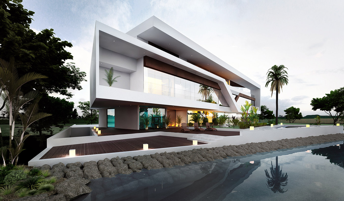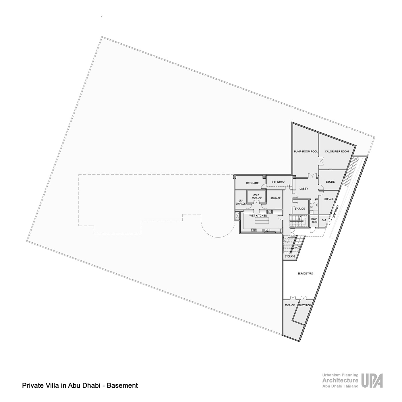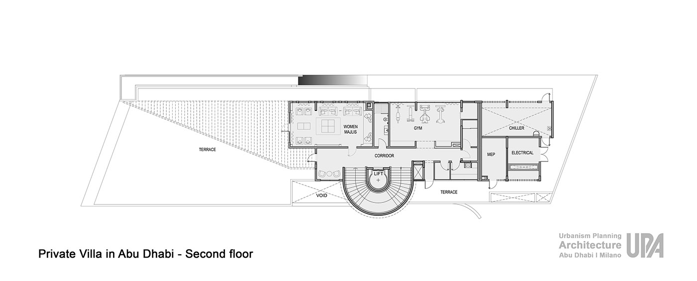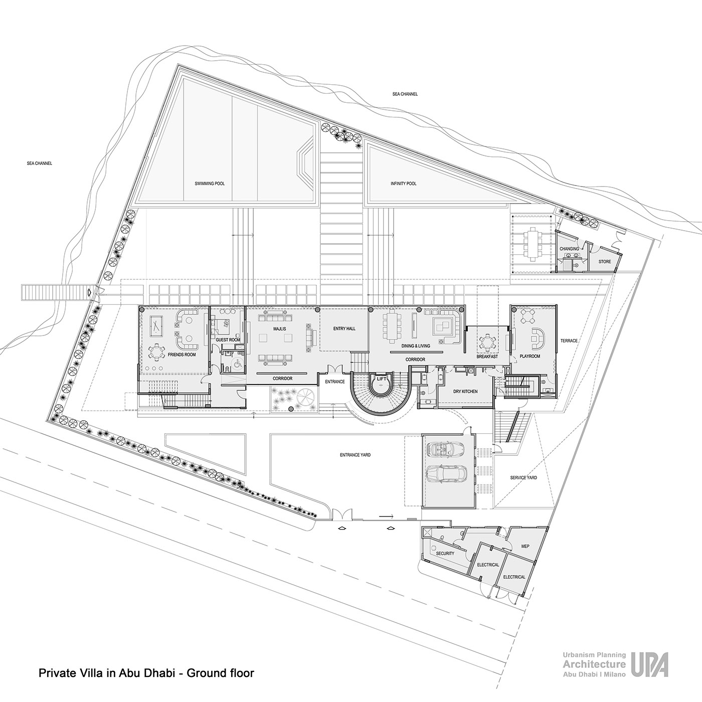 The villa, designed by UPA studio, is located on a plot of land between a fast-moving road and a narrow stretch of sea. The north entrance front facing the road has been designed with a semi-solid treatment to preserve privacy. The horizontality of the front has been balanced by the volume of the stairs with a cone-shaped form.