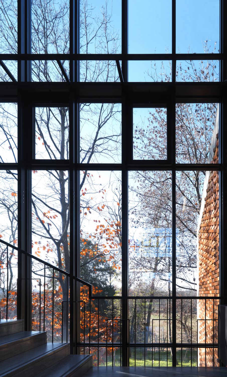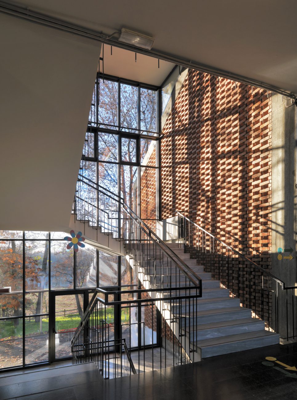 Inspired by the styles of post-war Scandinavian architecture, the simple and light forms of the school are distinguished by the extreme transparency of the façades, characterized by large windows that flood the rooms with natural light and promote the perception of the surrounding green spaces, emphasizing the direct relationship between the interior and exterior