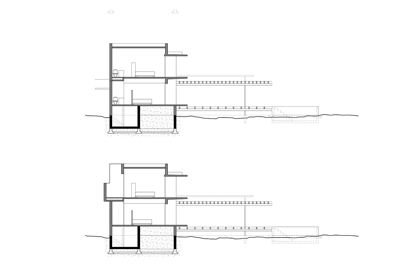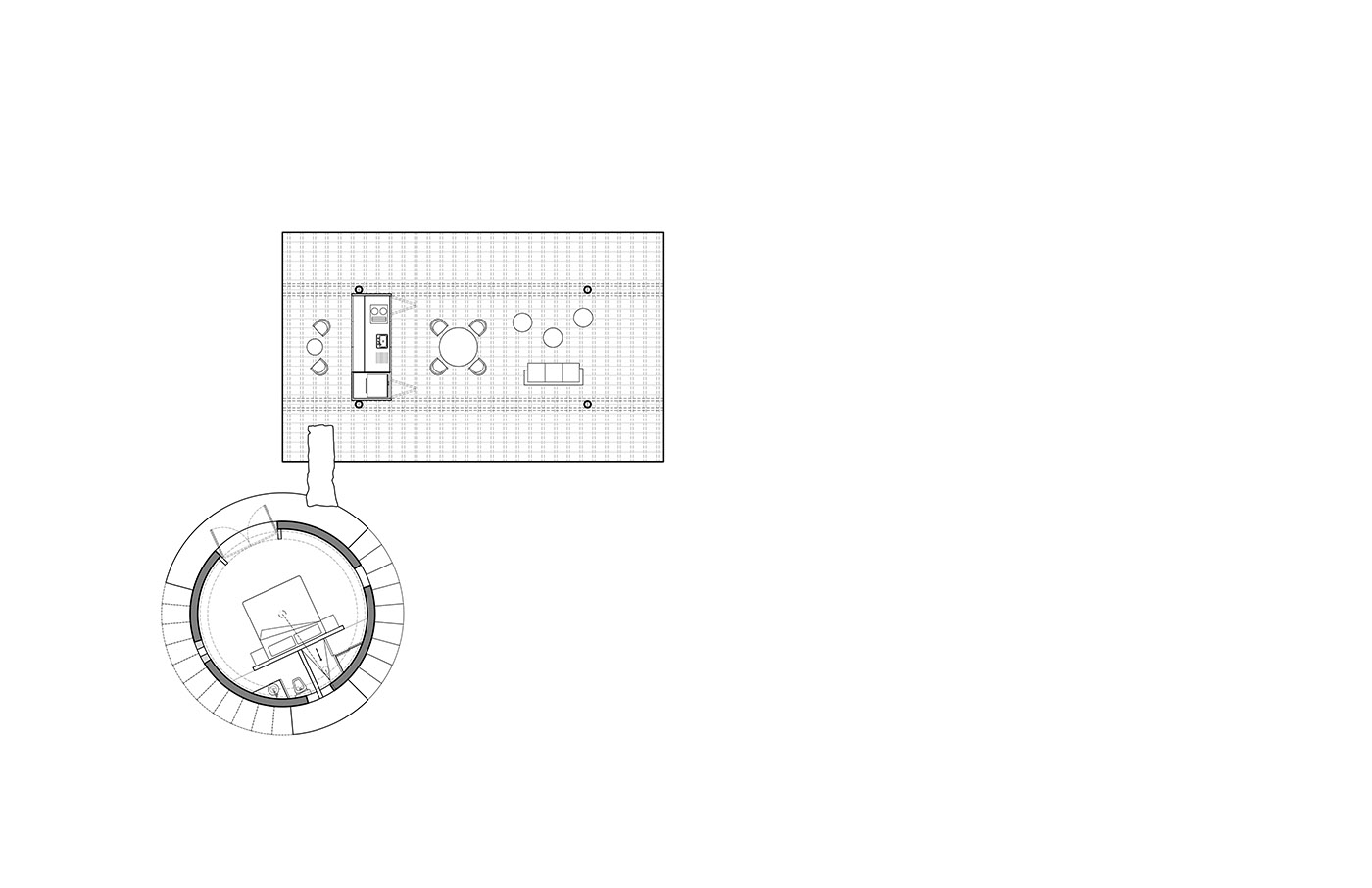 Adjacent to the tower, a light steel and wood structure floats on the landscape, housing the convivial area for the inhabitants who find themselves enveloped in the wild atmosphere of the place. The juxtaposition of firm and restrained volumes with the open living area becomes an opportunity to explore architecture in its most primitive and essential condition