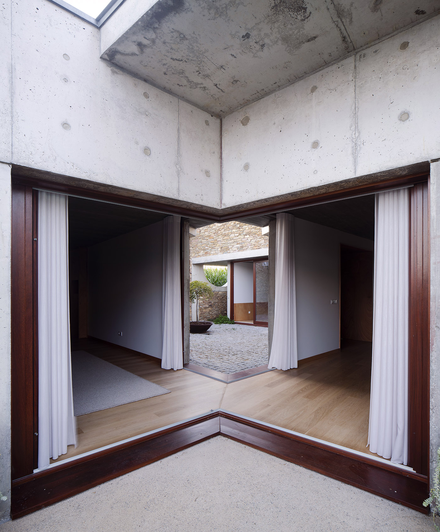 The concrete walls and slabs were designed both to fit the layout of the existing houses and a new organizational axis that defines the entrance space and the more technical area for car shelter . Between these two main volumes and the parking space, the design intended to create a system of four intimate patios, more or less open to the outdoor landscapes. Two of them belong to the street quadrant and the other two belong to the fields
