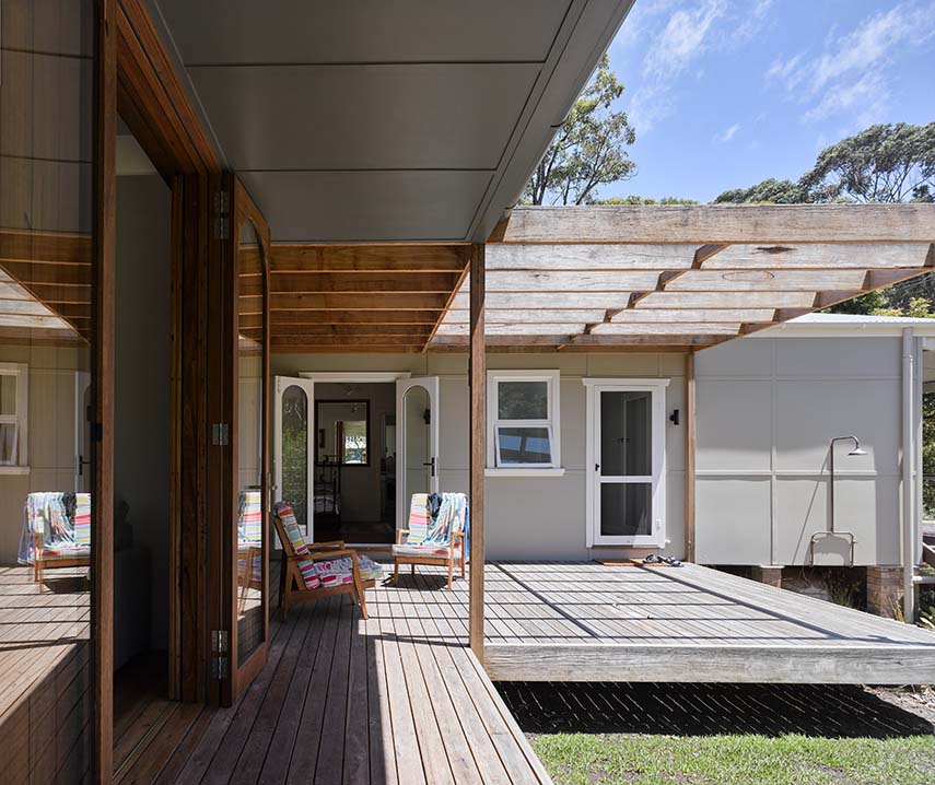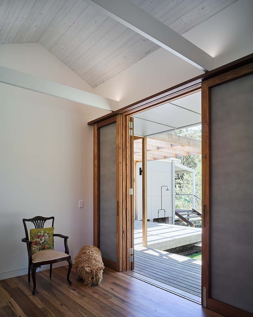 The existing cottage featured two bedrooms, a kitchen, dining room, terrace, living room, and laundry. The mandate was to make it suitable to accommodate the clients, their four children, and future generations. The existing home was kept intact except for the bathroom renovation and the relocation of the laundry and storeroom into new spaces. The extension is a simple pavilion, similar to the existing one, hosting a second bathroom and multipurpose rooms. The pavilions are separated to minimize their visual impact on the landscape and are connected by a wooden walkway loved by kangaroos and other local wildlife