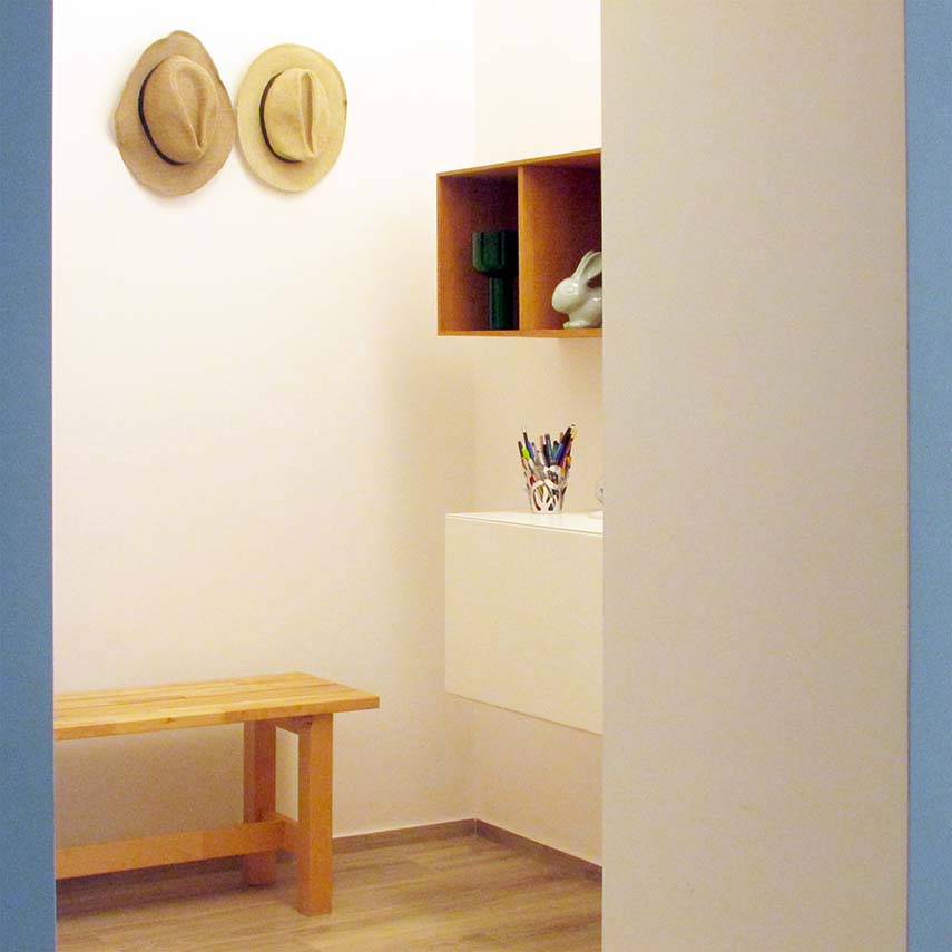 The ground floor of the building is completely renovated and dedicated to residence and studio. The new internal distribution respects the original load-bearing structure, integrated with additional partitions. The former professors' room, a large frescoed hall, becomes the new living room with an open kitchen: the strong contrast between the pure forms of the new architectural elements and the linearity of the contemporary furnishings with the opulence of the ancient decoration starts from this environment and remains the common thread throughout the intervention. The apartment then develops with a master bedroom with a walk-in closet and exclusive bathroom, a second bedroom, and service rooms consisting of a second bathroom, a storage room, and a laundry room. On the same floor, there is also a 25 sqm studio with a bathroom and a 17 sqm meeting room