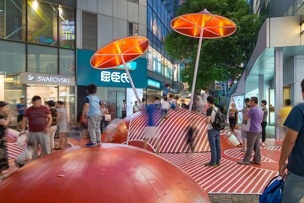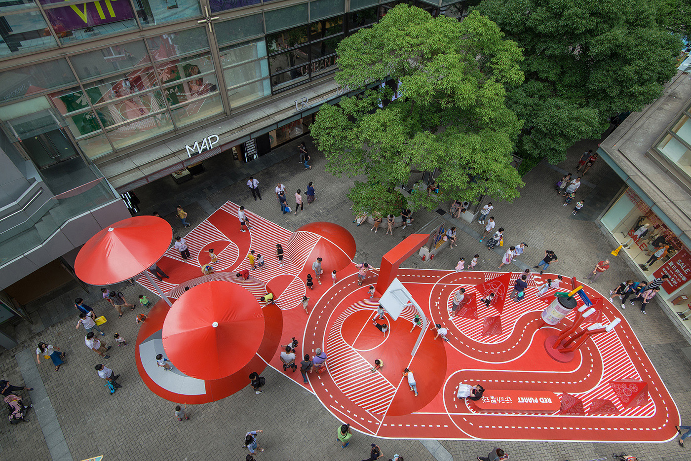 The Chinese "Red Planet", in the city of Shanghai, is designed by the studio 100 architects to encourage interactions and the stopover of adults and children in a commercial street space previously intended only for circulation