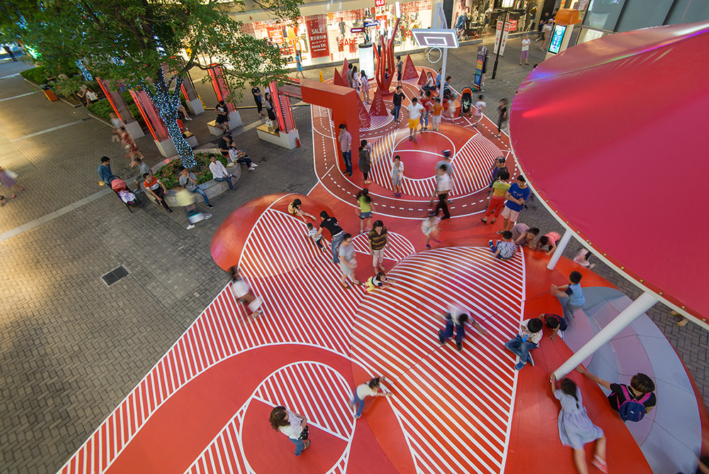 The Red Planet is a public space project within a commercial street, designed to enhance the experience of customers of the mixed-use shopping center. An area originally designated solely for circulation is transformed into a place to stop and spend time with one's family