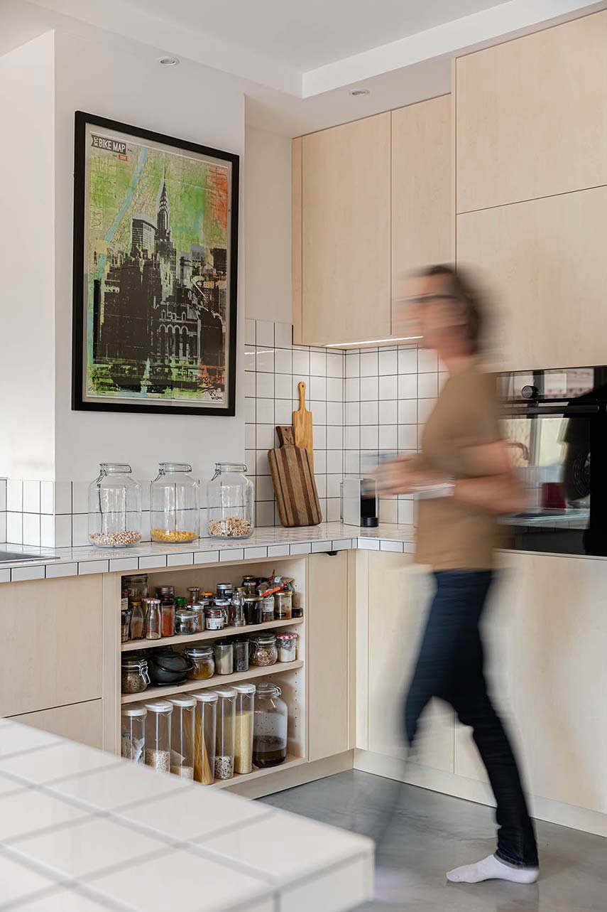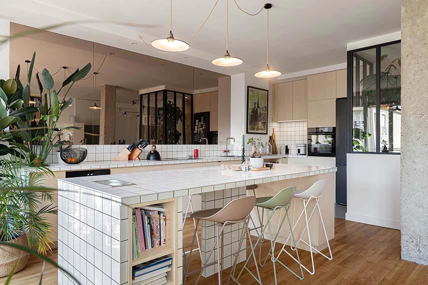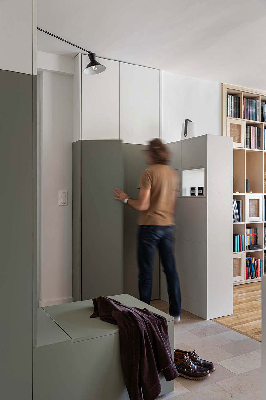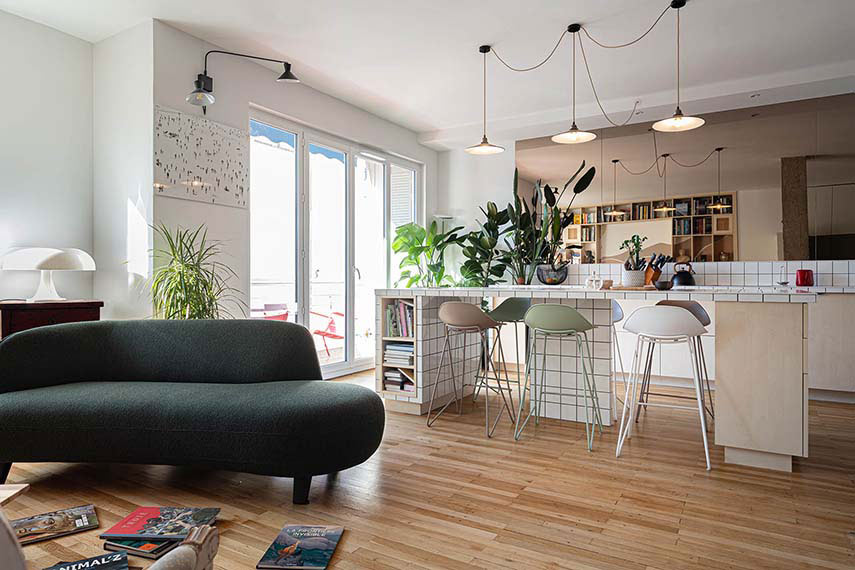 Interior architect Regis Lannoy designs the new layout of the "Croix-Rousse" apartment: 75 square meters originally divided with a hallway and a windowless bathroom, a bedroom, kitchen, and living room. A focus of Lannoy's interior design projects is natural light and its maximum circulation in the spaces. Here, after the renovation, there are no more windowless areas, the space is open and flooded with light