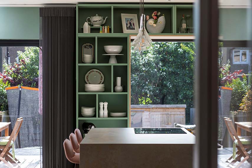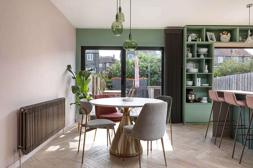 The terraced house subject of the intervention is located in the quiet suburban area of Corstorphine, Edinburgh. A previous front extension had created a long, narrow kitchen, separated from the living room and the rear garden. The fragmented layout meant that the family living there was often in separate rooms: cooking, doing homework, watching TV, etc