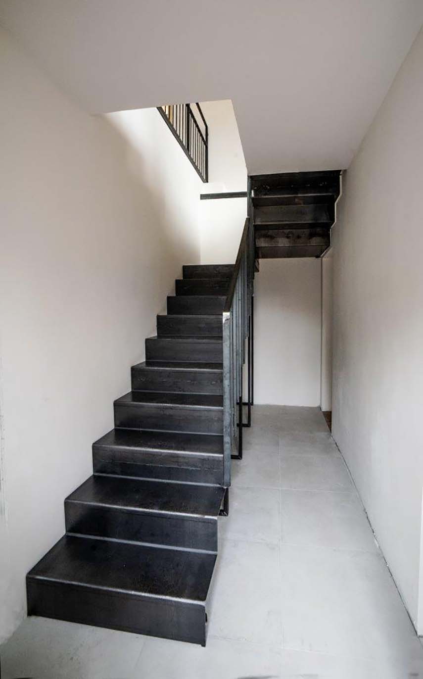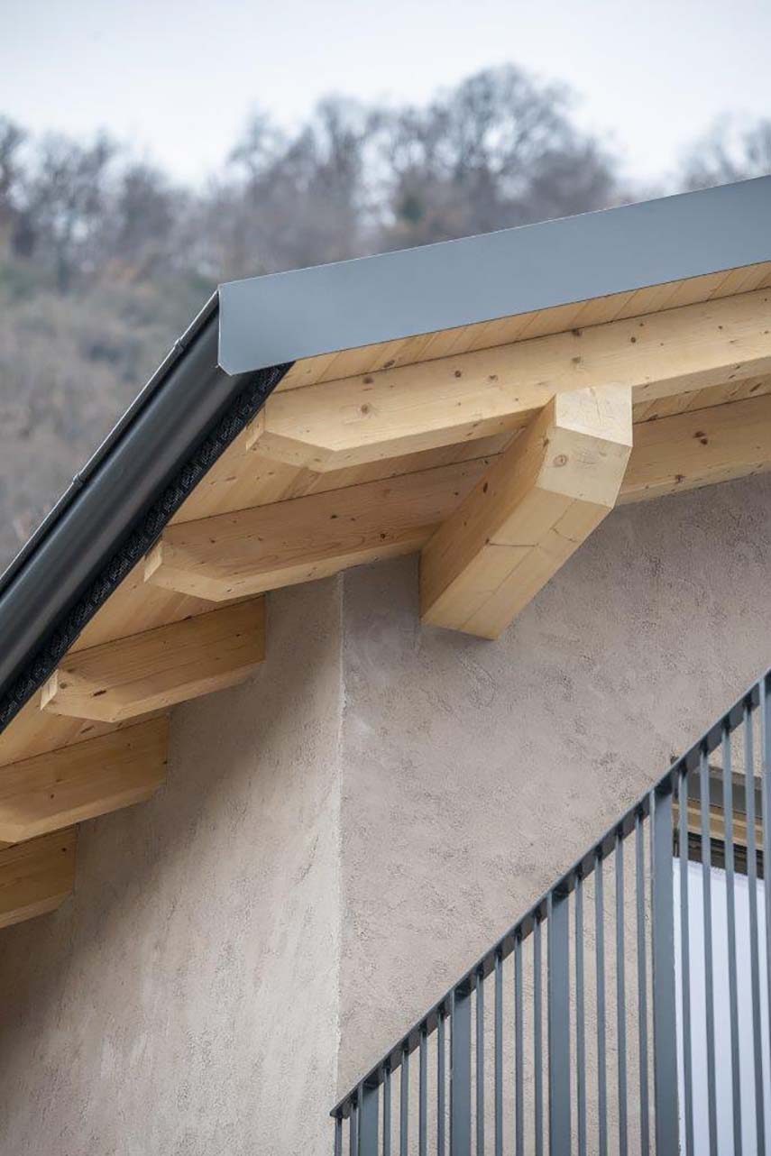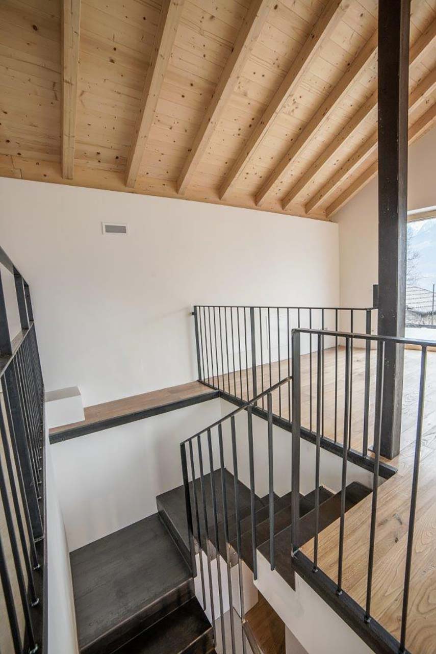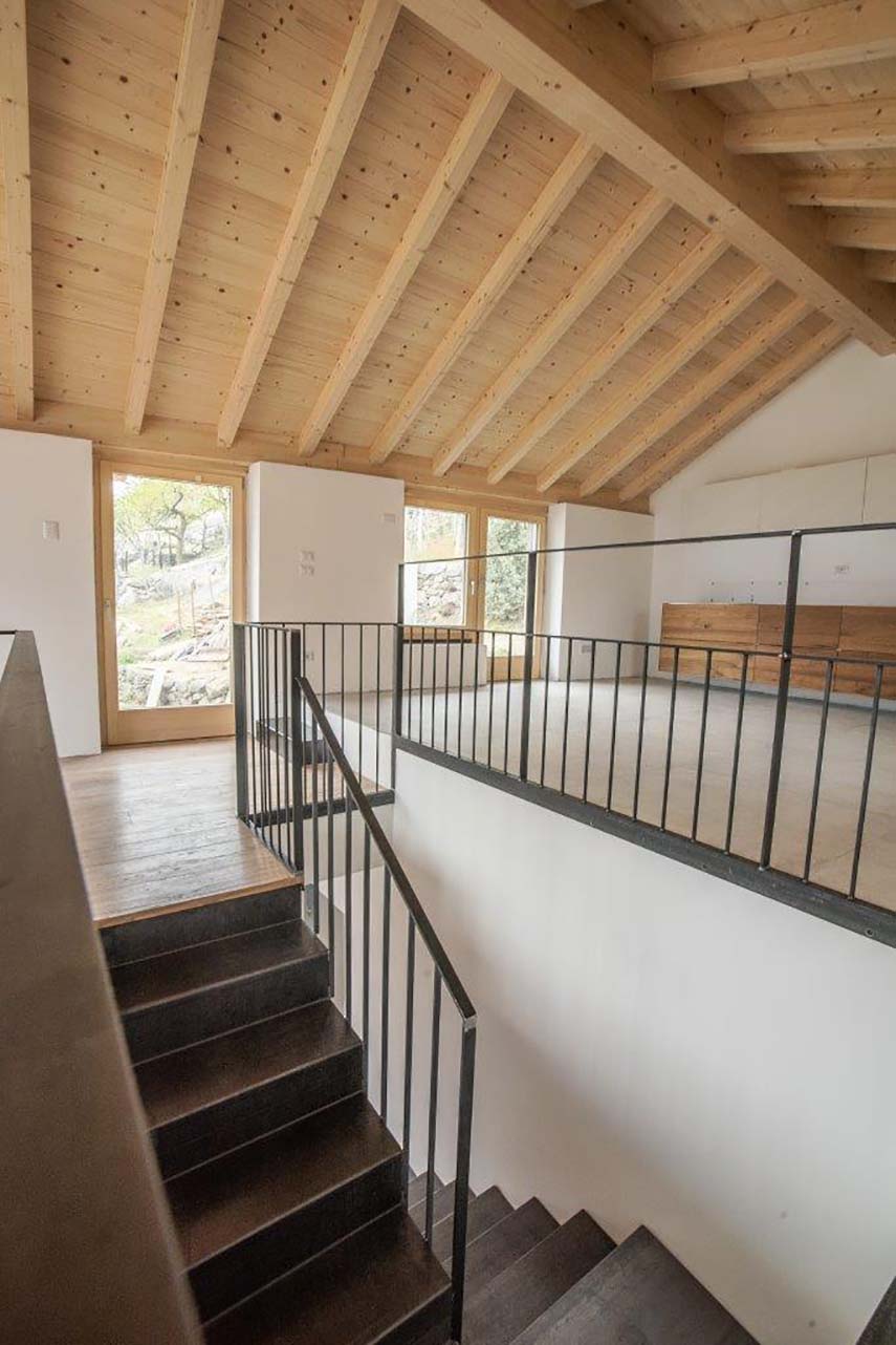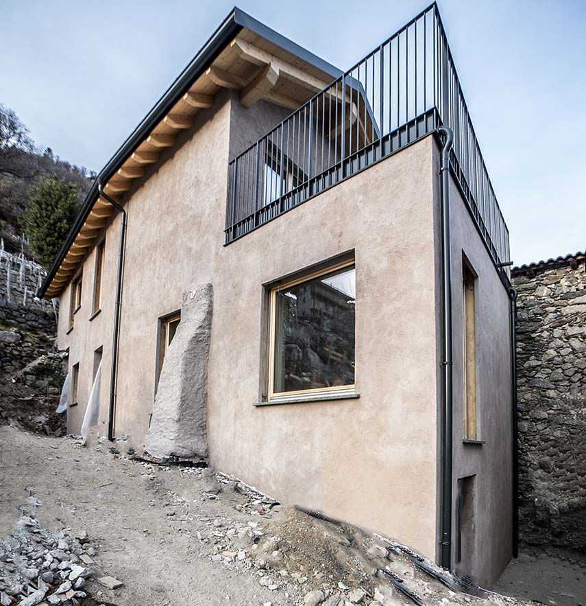 The interior of the building has been completely redesigned, maintaining the existing levels but redistributing the spaces for a better enjoyment of the environment. The open space living area occupies the entire floor, with chestnut wood floors and ceramic tiles in the remaining parts. The light-colored walls and the lime plaster finish create a bright and welcoming atmosphere. In the basement, there is a glacial erratic boulder, which has been enhanced. Outside, the old cobblestone entrance has been restored, connecting to the new extension.