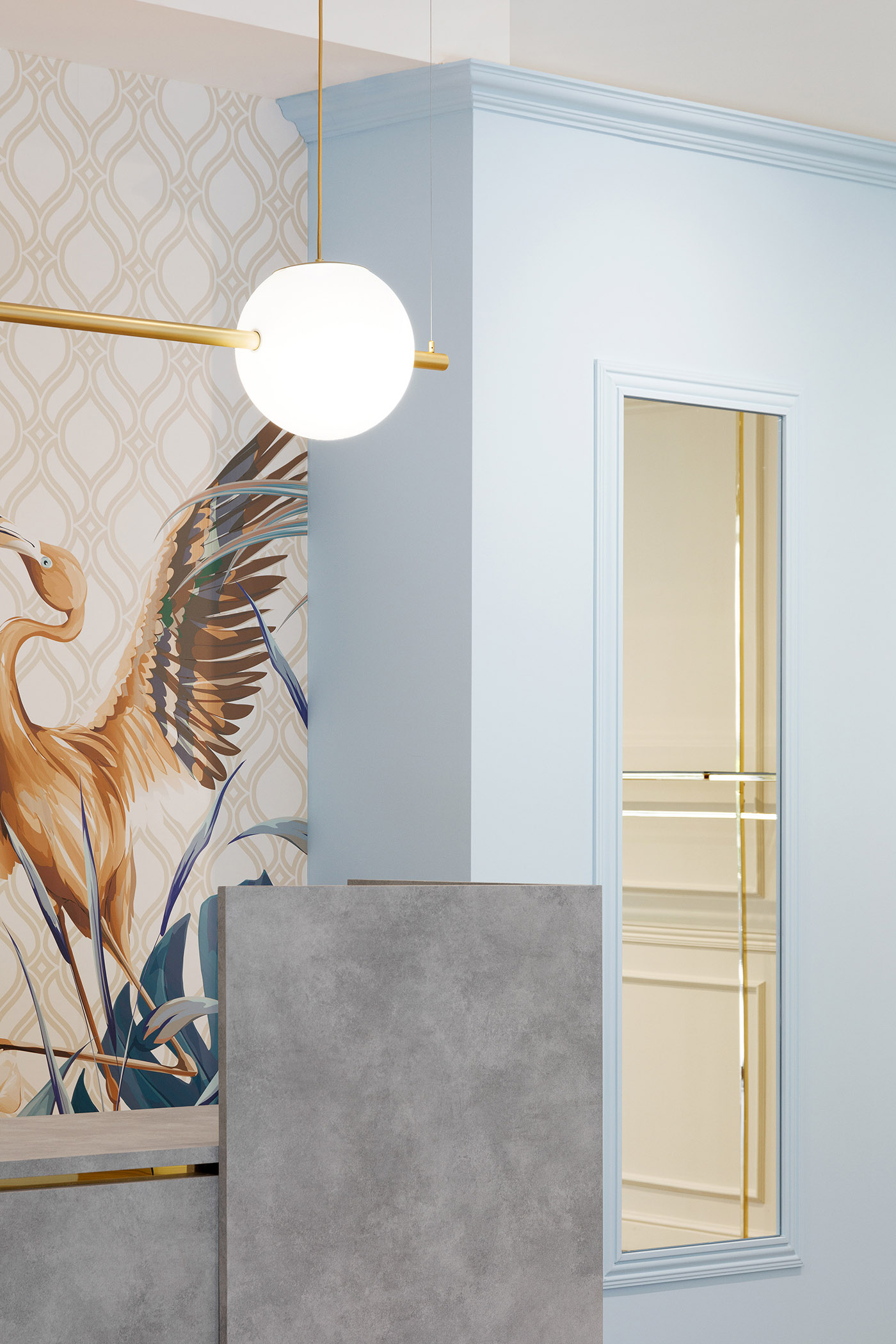 An exclusive space for high fashion garments has been created inside the Reve Store. It stands out from the other display areas thanks to the full-height boiserie and chrome-plated gold display structure which gives brightness and embellishes the entire environment. This interplay of shapes and materials creates a minimal silhouette inspired by the lightness of the limbs of flamingos that are shown in their delicate elegance in the wallpaper laid on the wall behind the cash register. The latter area is identified by a monolith in gray tones and marked in gold that contrasts the wall with wallpaper in various shades