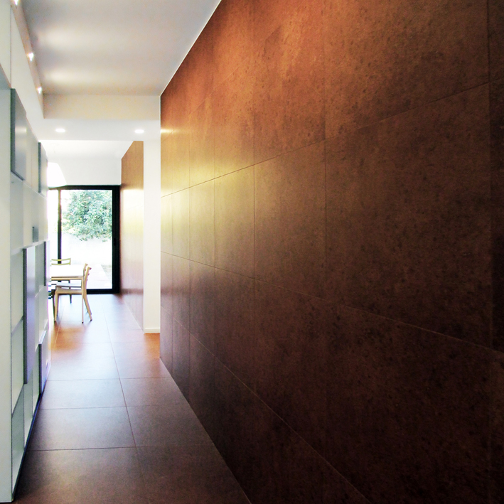 Il limite tra il living e gli ambienti di servizio è enfatizzato da una parete rivestita a mo' di boiserie contemporanea che viene attraversata centralmente dal varco di comunicazione tra i due macro ambiti domestici
