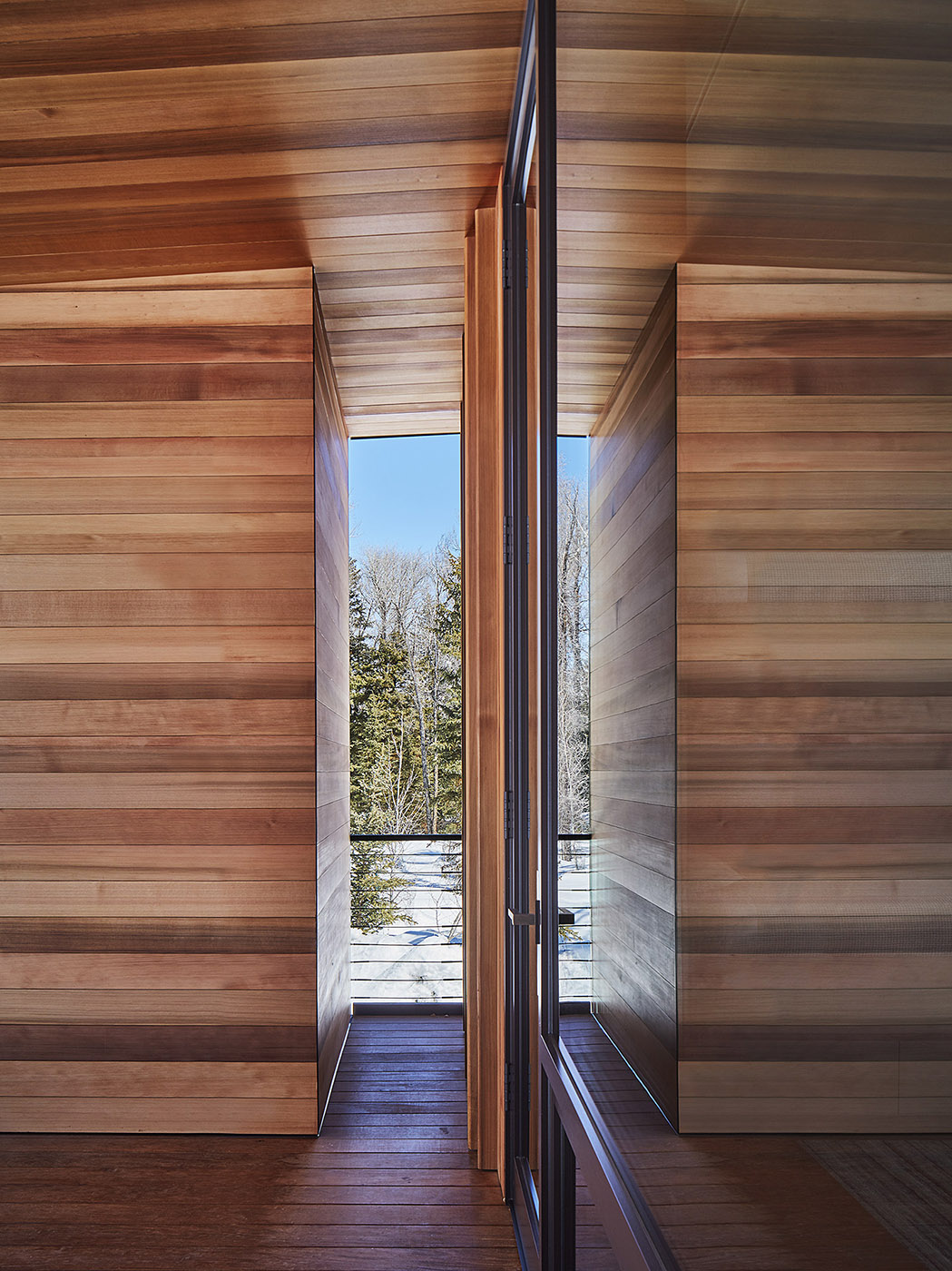 The spaces seem sculpted. The cedar-clad parts provide warmth and contrast with the metal parts of the building. The cedar, which is arranged in an undulating pattern, creates textures and shadows, while the steel trim is designed to rust slowly, further integrating with the site. The external materials are transported inside: concrete, white plaster walls and cedar ceilings