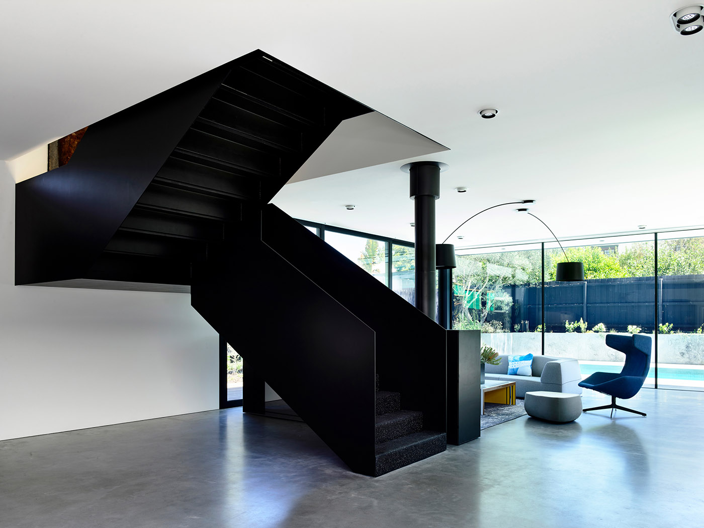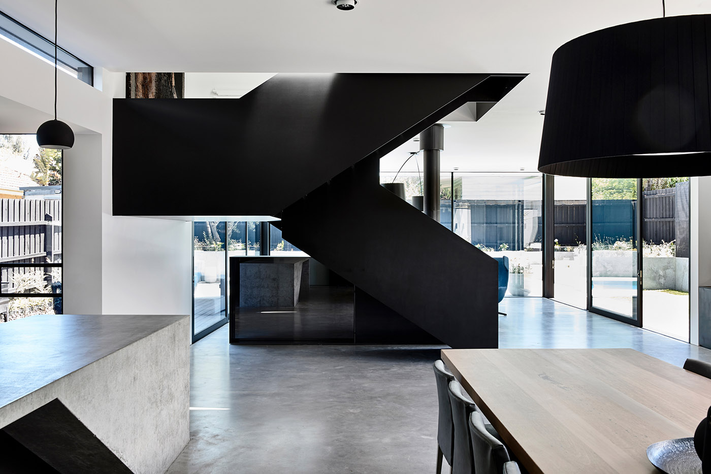 The minimalist aesthetic of the interior serves as a gallery for the client's art collection. The sculptural elements of the steel staircase and concrete kitchen counter dialogue. The use of mass materials to form detailed interior objects contrasts with the exterior form that is singularly defined by light, repetitive elements