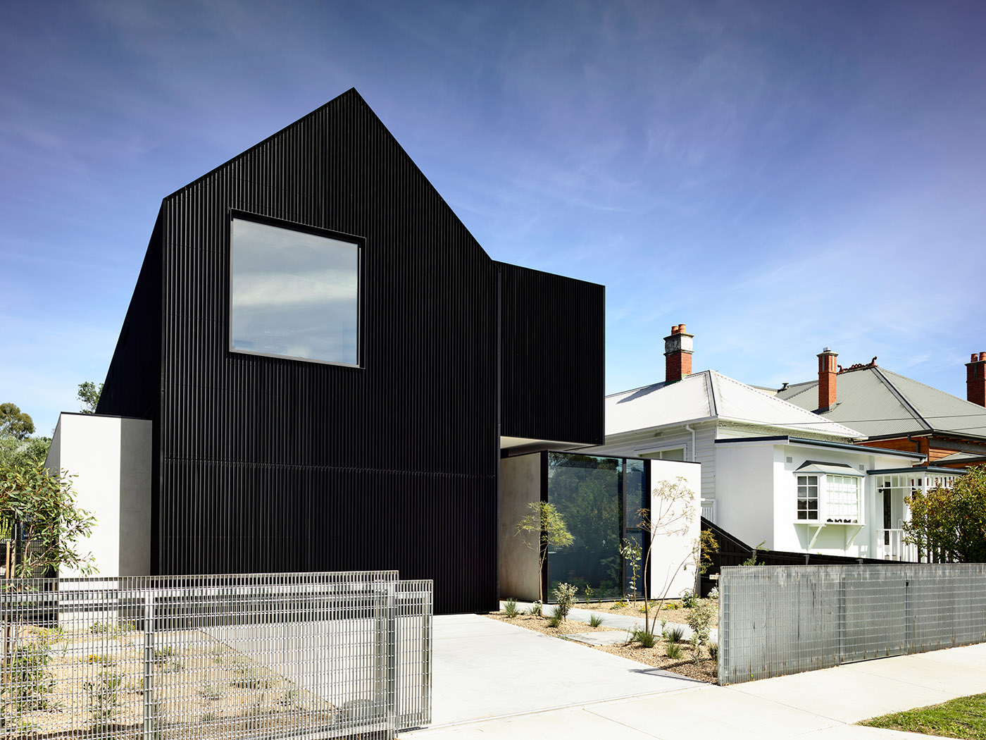Ross features a gable shape reminiscent of the neighboring bungalows but increased in scale. The public façade and entrance, the living area within a secluded garden, and the private realm upstairs, provide unique and atmospheric environments for the public and residents respectively