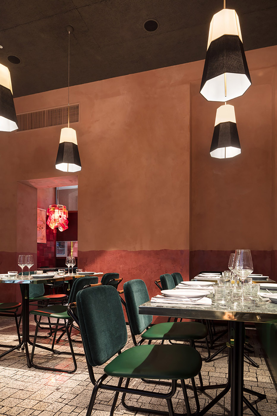 The tones are warm and dominated by the red colour "Marsala", which echoes the fundamental relationship with wine and the land. The use of materials is meticulous and limited and reduced to a few basic types (lime, brass, oak), almost as if they were the ingredients of a recipe on the menu