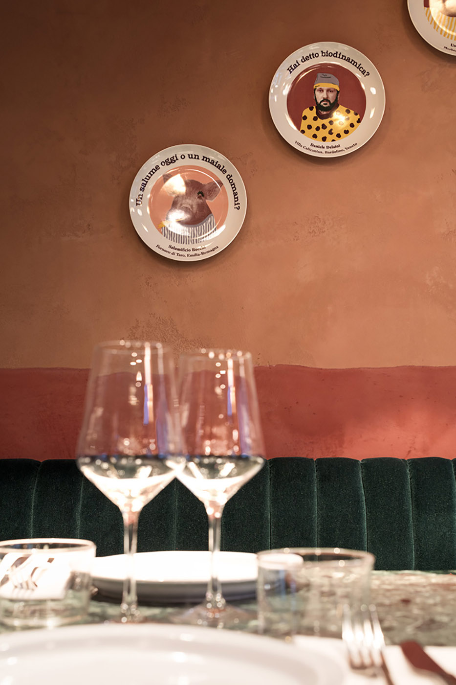 At the entrance, a large wall highlights the restaurant's protagonists: it is the Wall of Fame, 16 ceramic plates, each depicting a manufacturer of the raw materials used in the kitchen. On the opposite side, the bar counter is distinctive for its long solid oak top and vertical cladding made from natural brass profiles with different sections