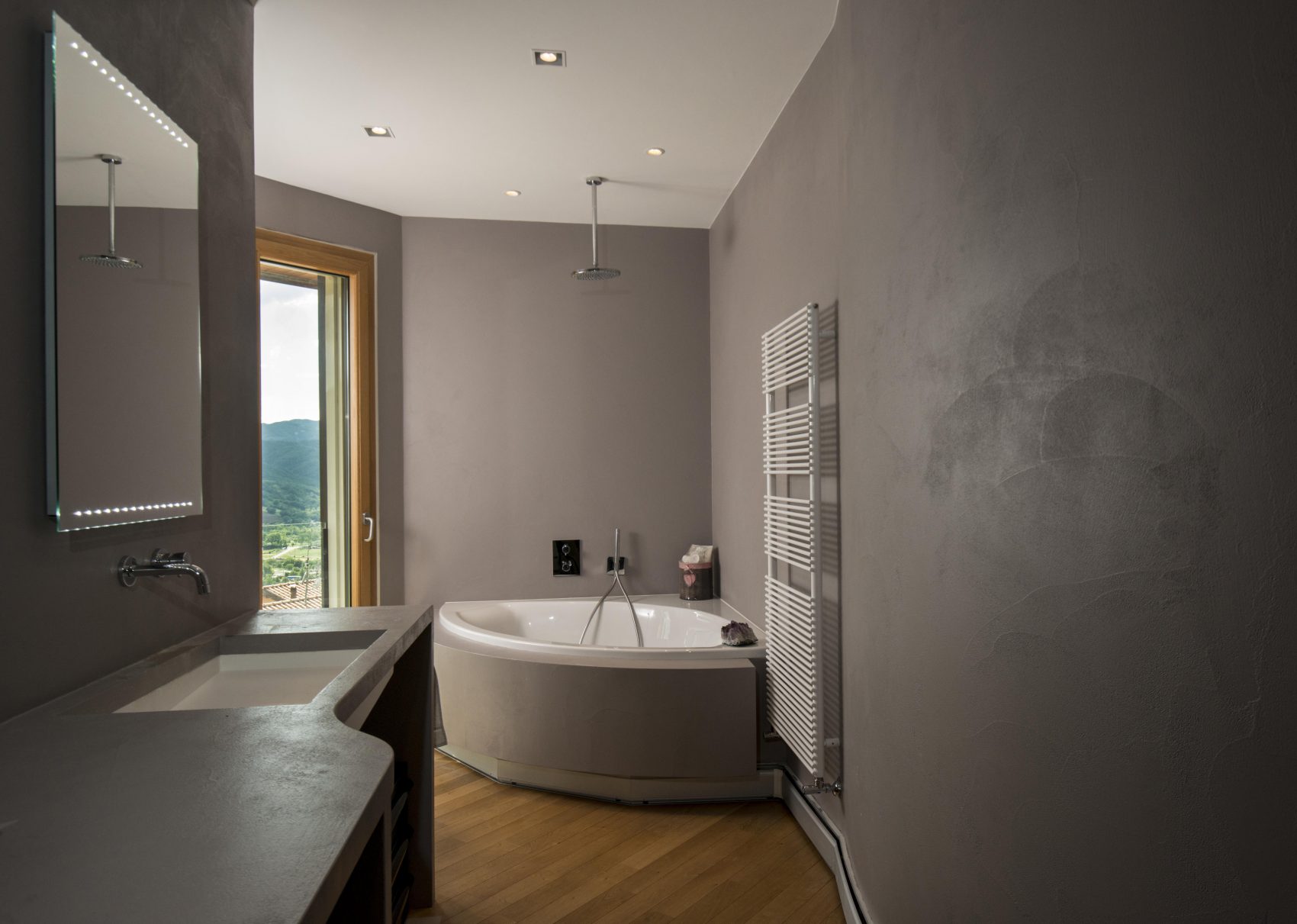 For heating and cooling, as well as for the production of domestic hot water, the house makes use of a geothermal system integrated with solar thermal panels, which combined with a photovoltaic system make it energy independent from fuel gas and electricity supplies. A storage tank is used to collect rainwater for non-drinking purposes