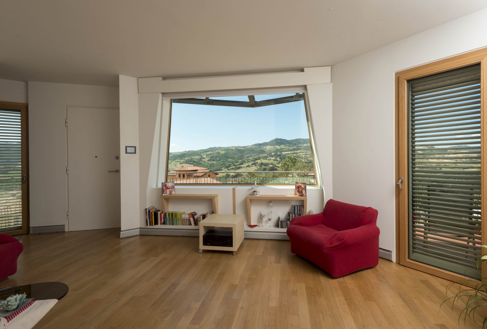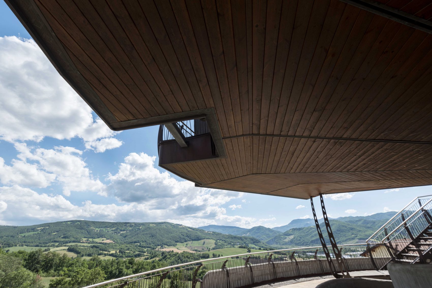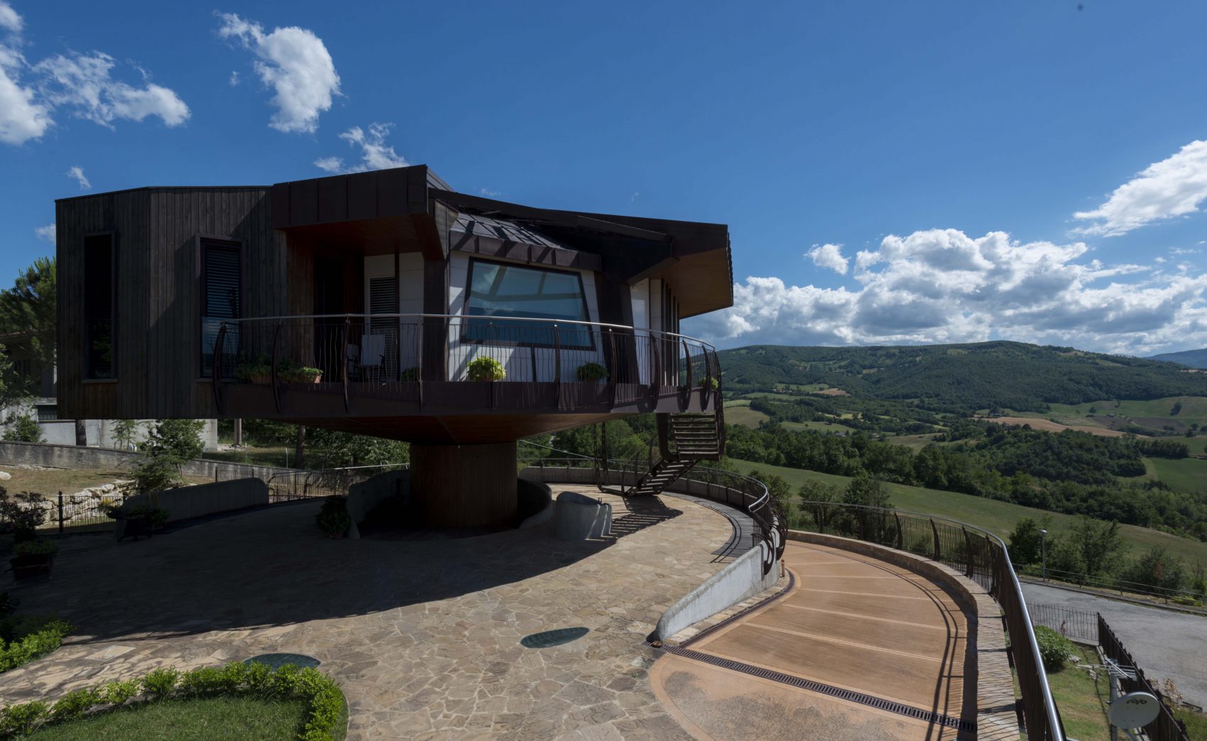 In the province of Rimini, the architect Roberto Rossi, on request of the client, creates a wooden house that can rotate 360° thanks to a single central pillar on which it rests, enabling solar panels to follow the natural movement of the sun and dwellers to change the landscape at any time. The challenge is to keep the building lightweight and to enable it to withstand the impacts caused by its rotation