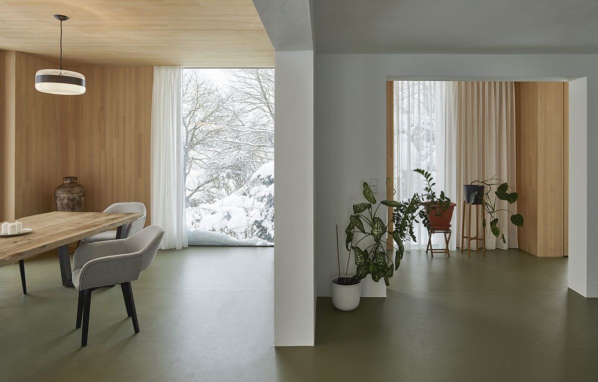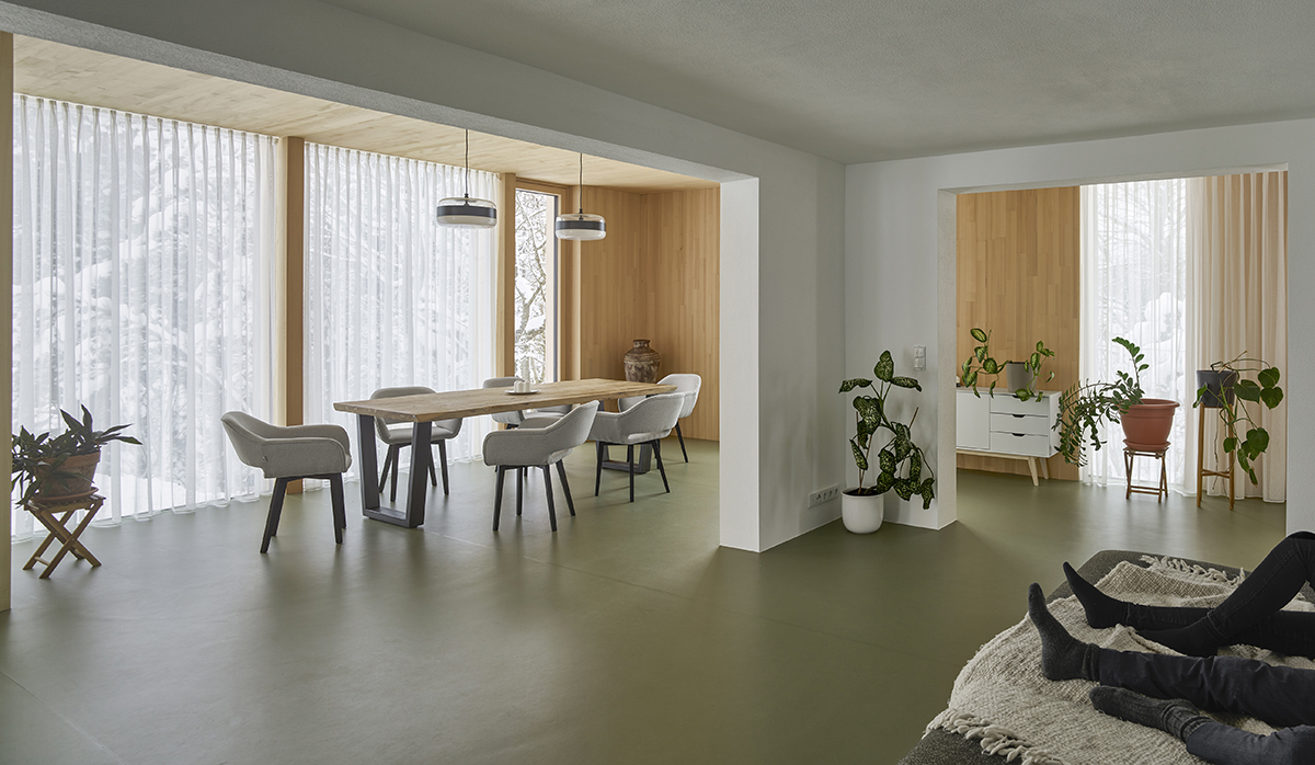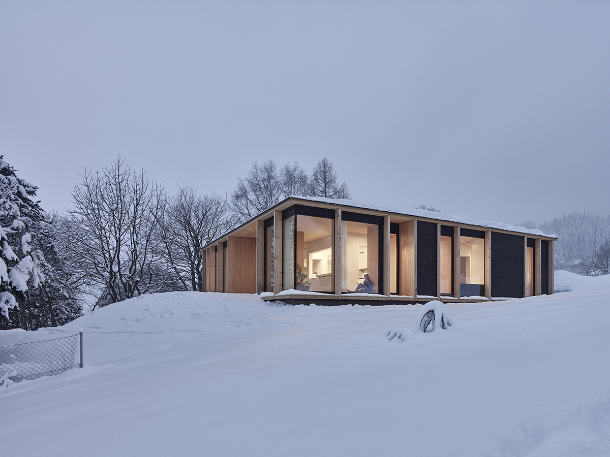 From 70sqm, the house reaches 150 sqm and the new floor plan works as a continuous space. The natural wood structure, the dark window frames and the darkly glazed pine panes make the house look like a pavilion in the landscape