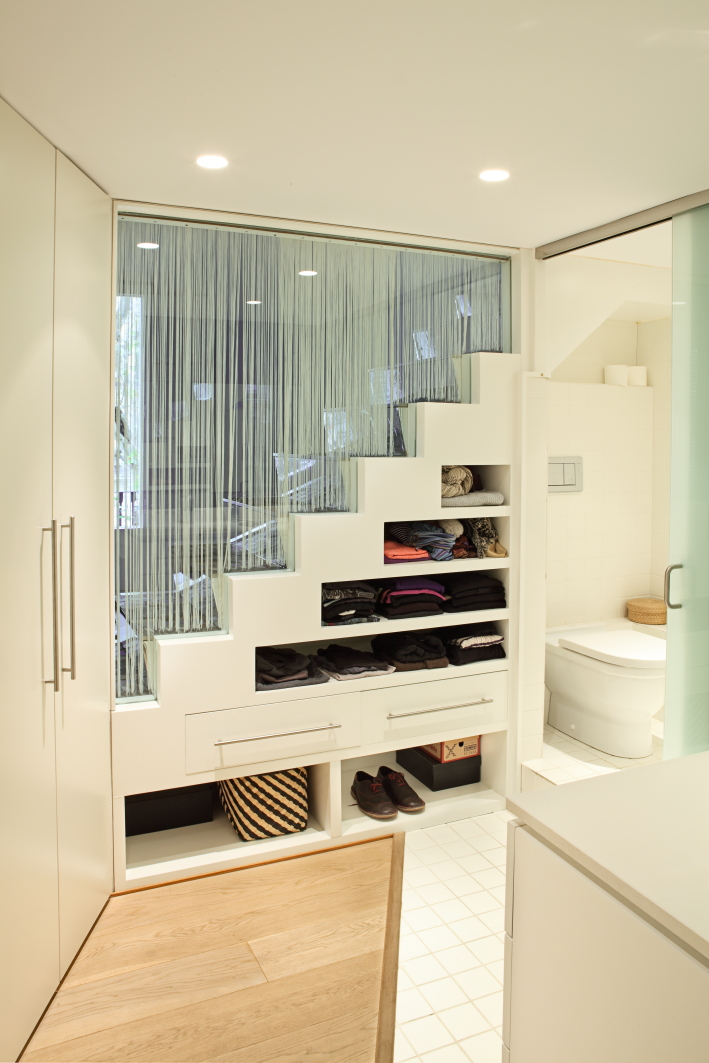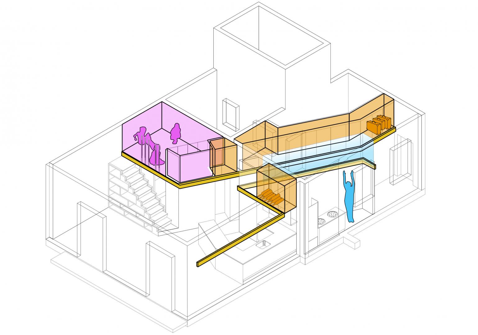 Two gold guides re-trace the bodies that slide on both sides of the diagonals, two technical guides that support the wired, lighting, door guides and a sliding staircase. These golden lines establish a horizontal division in the plain: up to 2.20 m slides through the living space and, above all from the given chariots of space, with another staircase organizes storage lofts, bottle racks, the entrance of the zenithal light in the bath or a multipurpose room