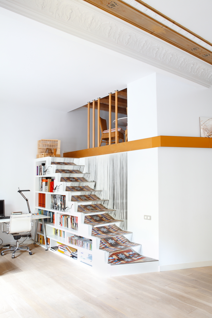 The apartment develops a fresh interaction with its origins that can be discovered between the gold ceiling art craft of the dining room and the dance of illuminated water drops in the tactile experience of the wooden beams that support the floor within reach of your hands in the mezzanines or staircases - furnishings that the wealth formed for the mosaic re-consisted of the old life, which multiplies with reflection like a magic carpet.