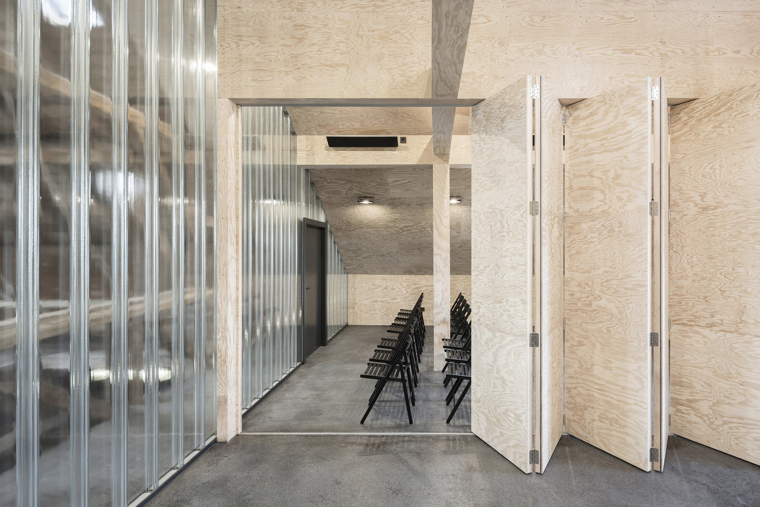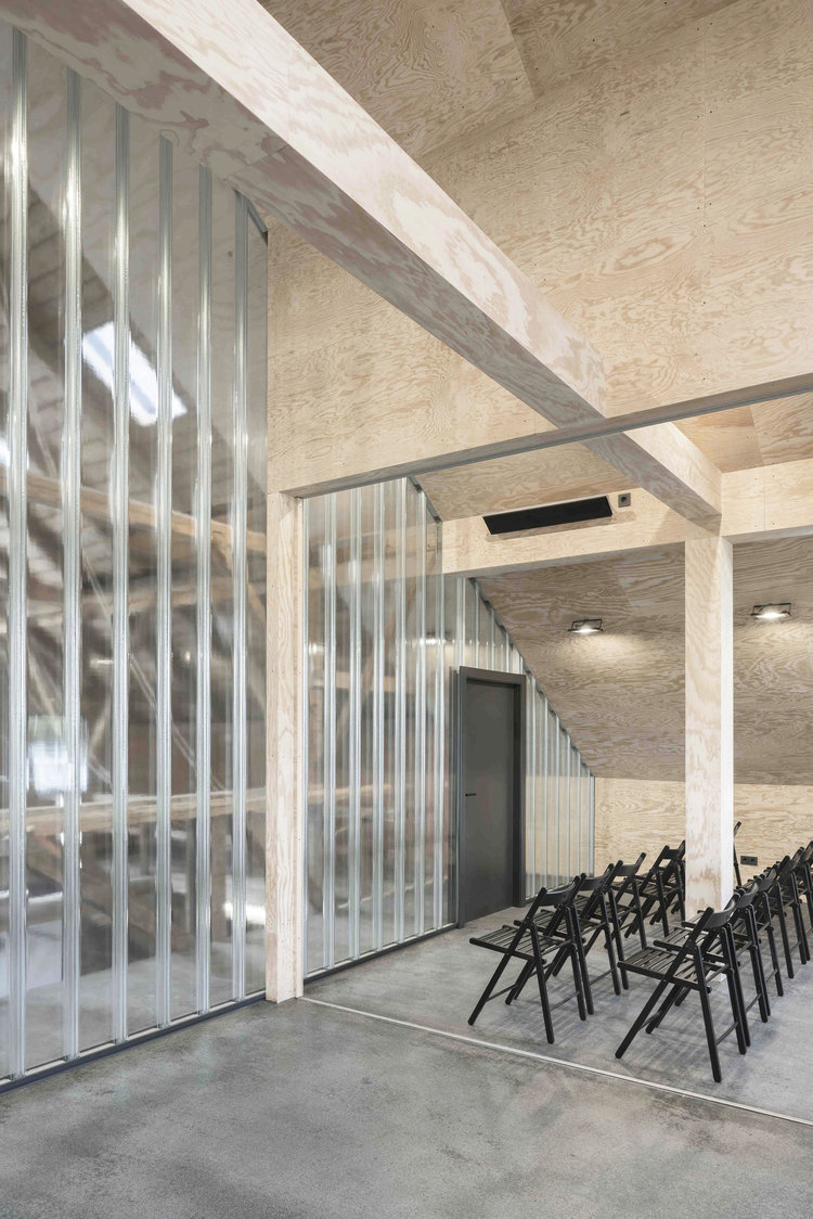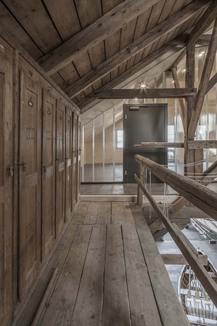 Una parte viene disposta a palestra, dove I marinai hanno l'ambiente adatto per addestrarsi. Per gli interni sono stati utilizzati materiali riciclabili e rinnovabili, non trattati chimicamente. I rivestimenti sono stati realizzati in multistrato di pino di Aleppo, in dialogo con l'edificio esistente. La stanza ha un'atmosfera pacifica, in contrasto con la capriata storica del tetto