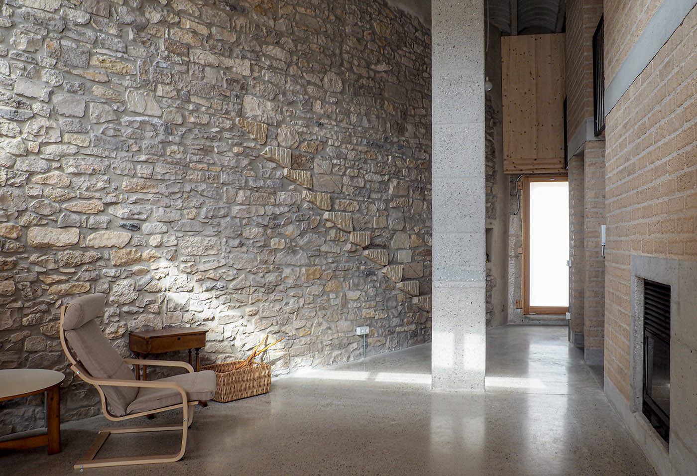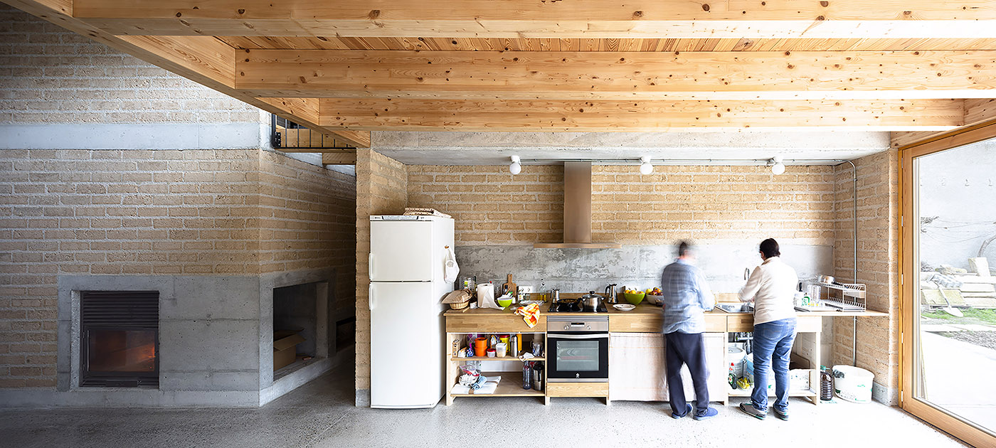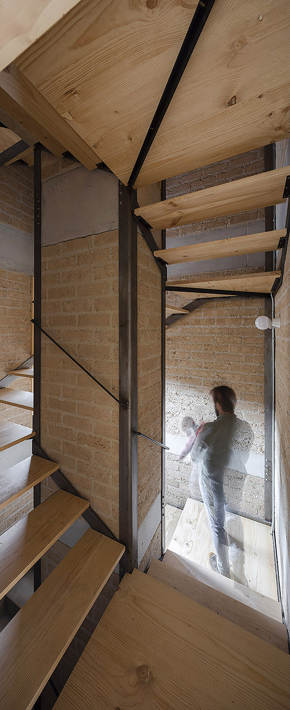 The core is formed by a masonry wall of compact earth blocks, which creates open spaces for storage or installation, closed spaces and passageways connecting or separating the rooms. All the services of the house are concentrated in the centre, with the aim of not altering the original stone walls
