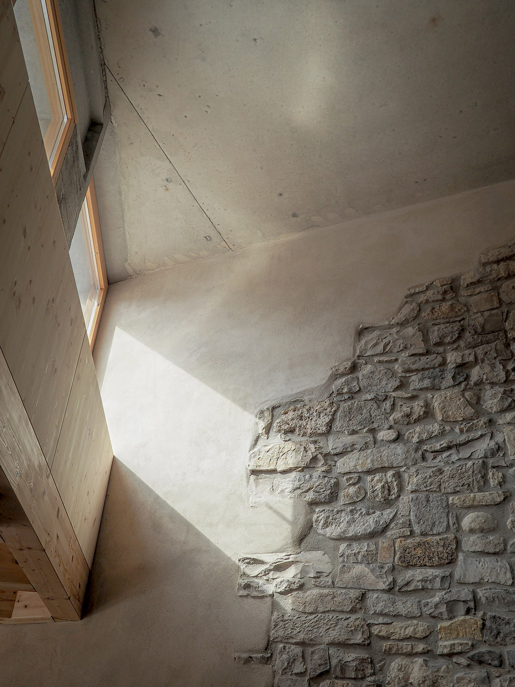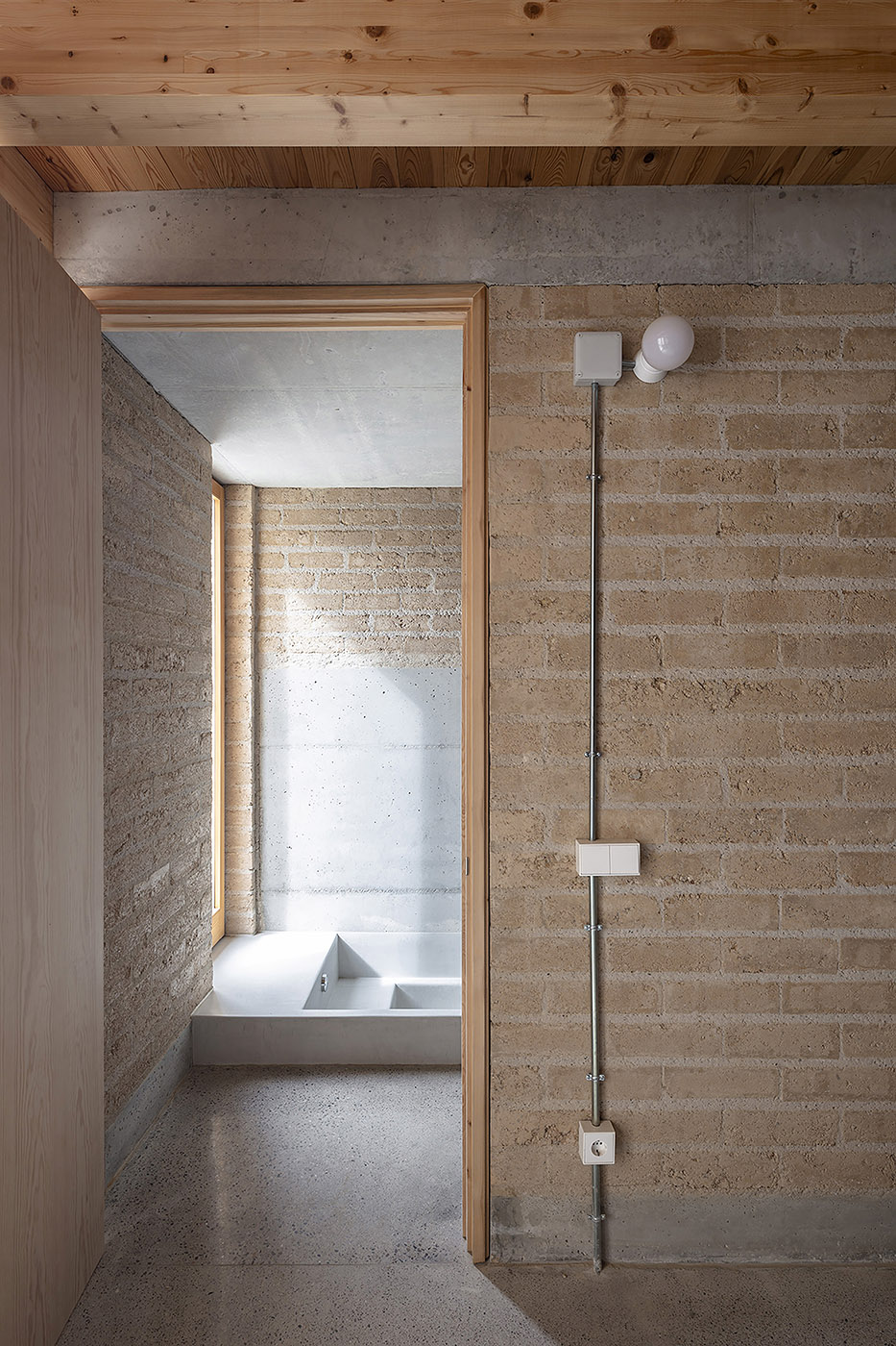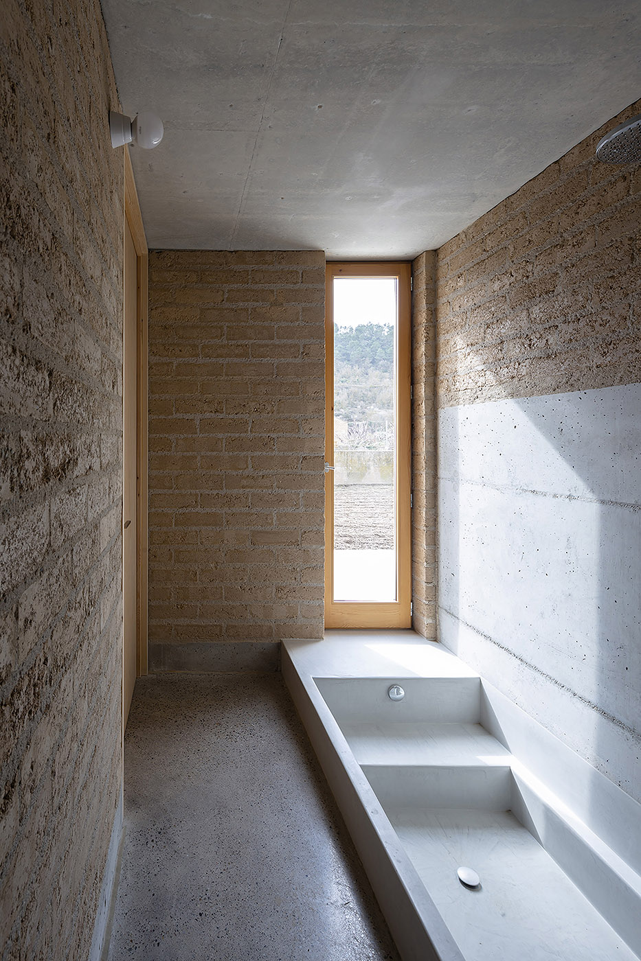 The core is formed by a masonry wall of compact earth blocks, which creates open spaces for storage or installation, closed spaces and passageways connecting or separating the rooms. All the services of the house are concentrated in the centre, with the aim of not altering the original stone walls