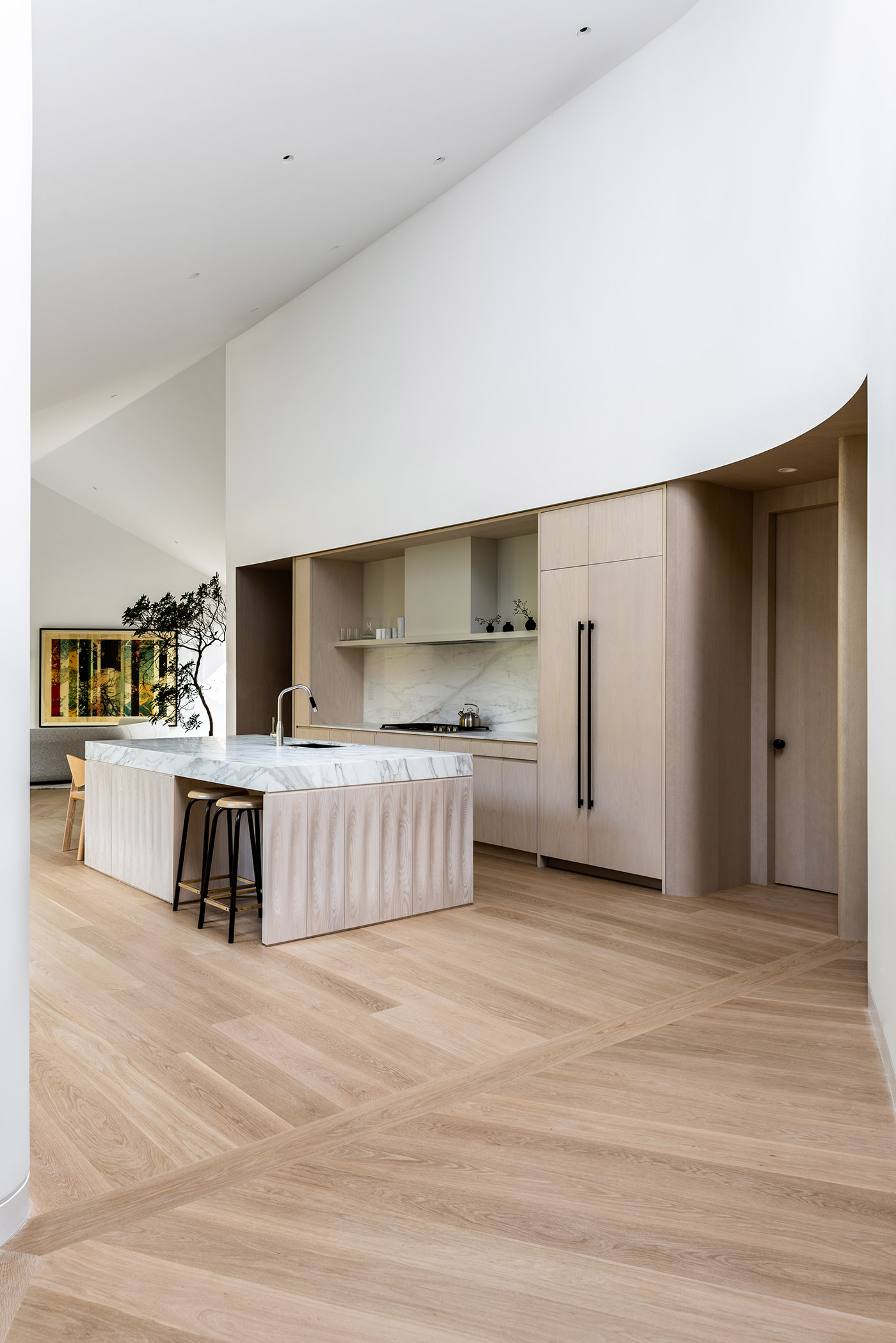 "The interior palette was chosen to have a general lightness and warmth that is suited for a summer home in the Hamptons: soft, light wood trim, warm white walls and stone countertops," says Marciniak. "Materials are generally composed in a way that acts as structural variations on a narrow color palette rather than high-contrast or high-volume materials."