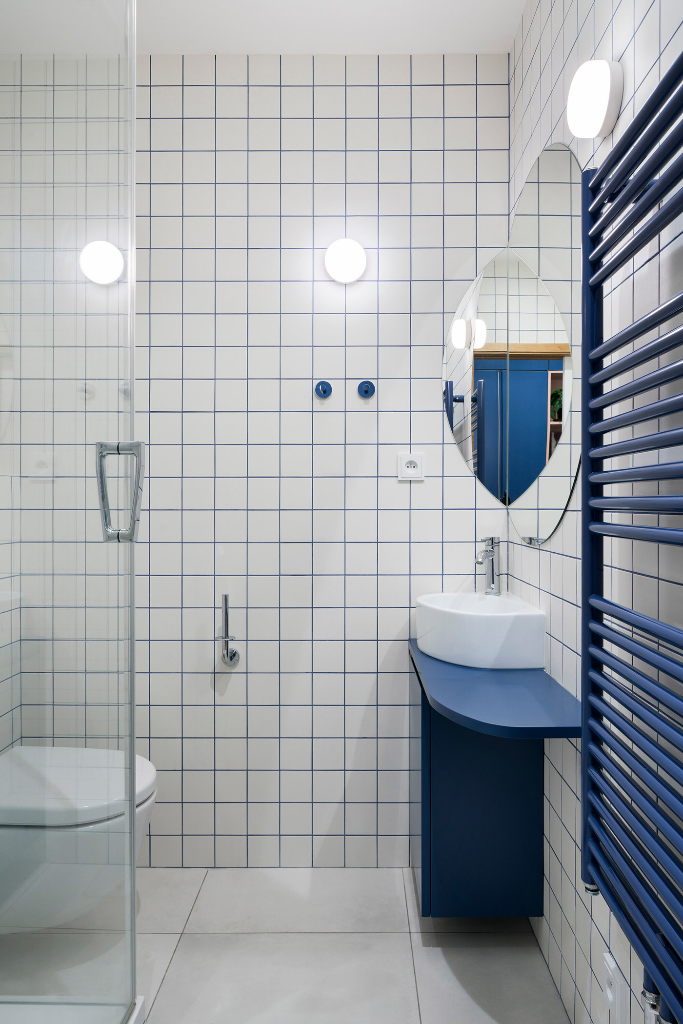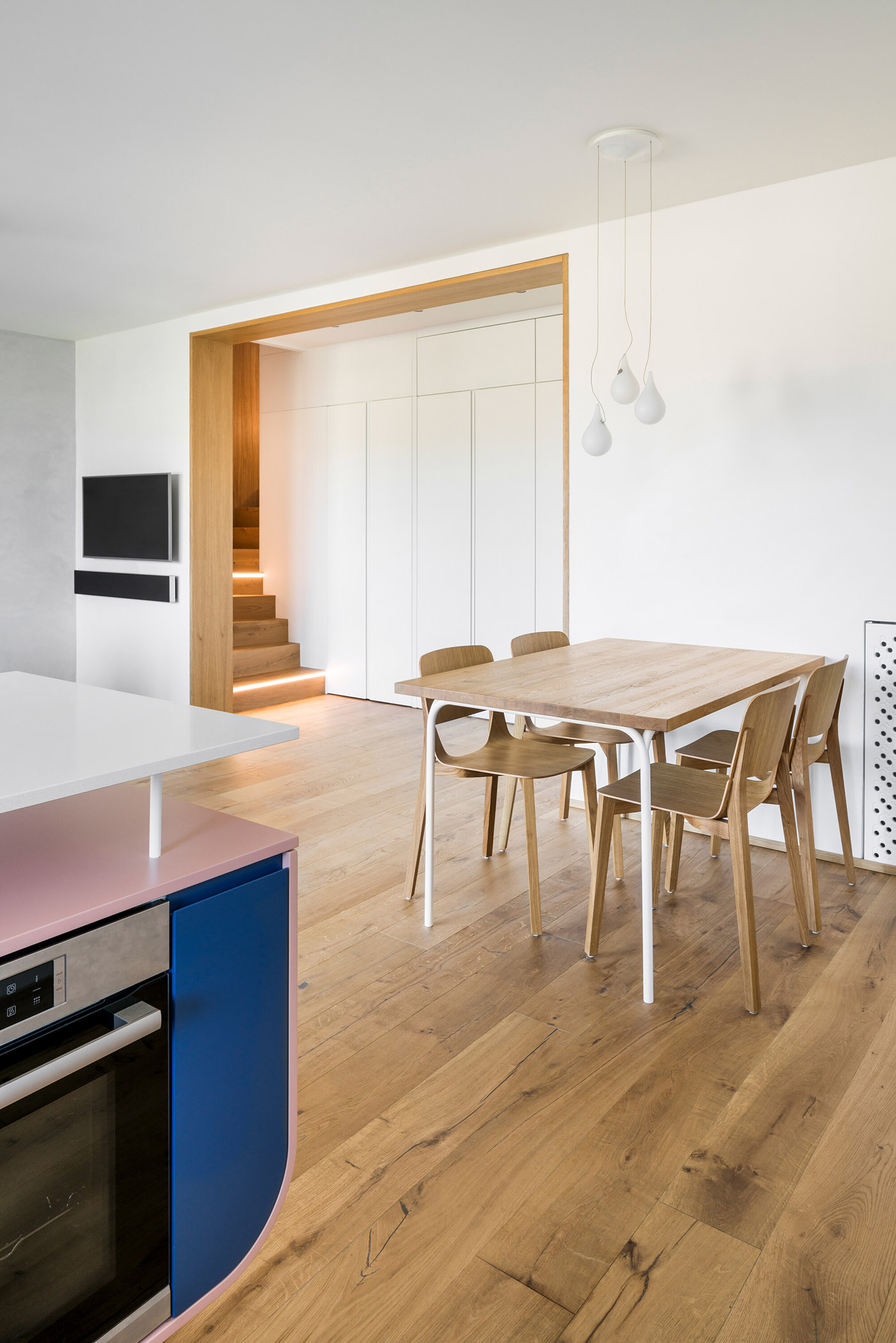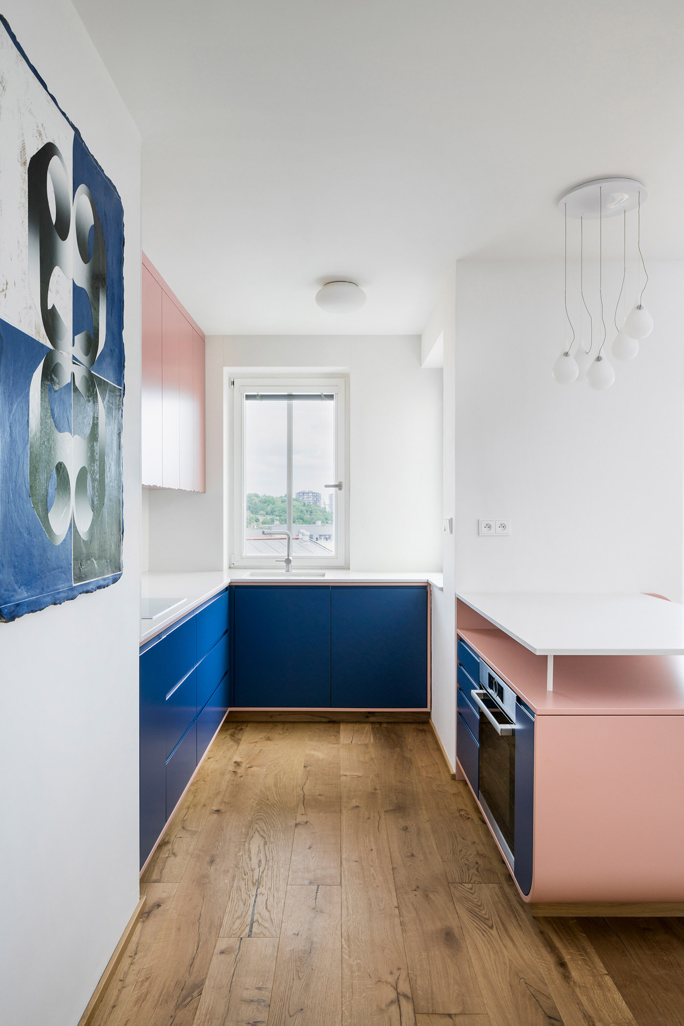 Studio No Architects incorporated two striking paintings into this project, and at the same time this design featured in the two paintings. The number sixty-nine, depicted in a painting by Vladimír Houdek, has a special meaning for the owners of this space. This theme is echoed in the specially designed furniture and heating covers. The unusually rough edges of the paintings are echoed in the kitchen cabinet doors. The colors of the paintings match the colors of the interior-from the obvious connections to the discrete ones, such as the color of the wall covering behind the shelves