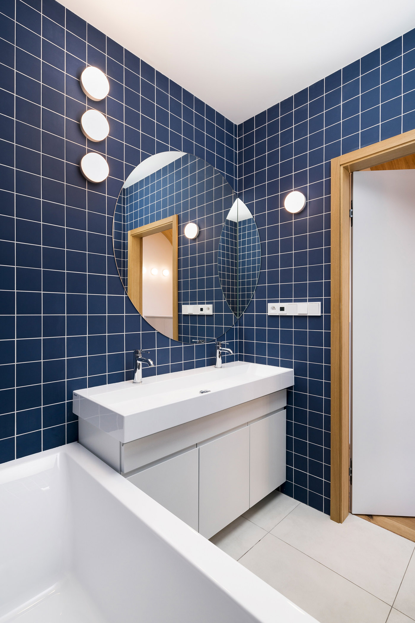 The shade of the wall behind the bookcase was carefully chosen so that it would be in harmony with the second painting, a work by Josef Bolf. The elegant melancholy of this piece is thematically echoed by the tear-shaped lights and placement of this painting: visually it is connected to a large waterfall painting by Patrik Hábl that can be seen from the living room window on a nearby building