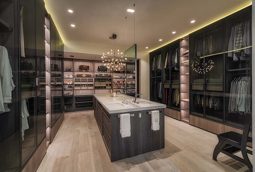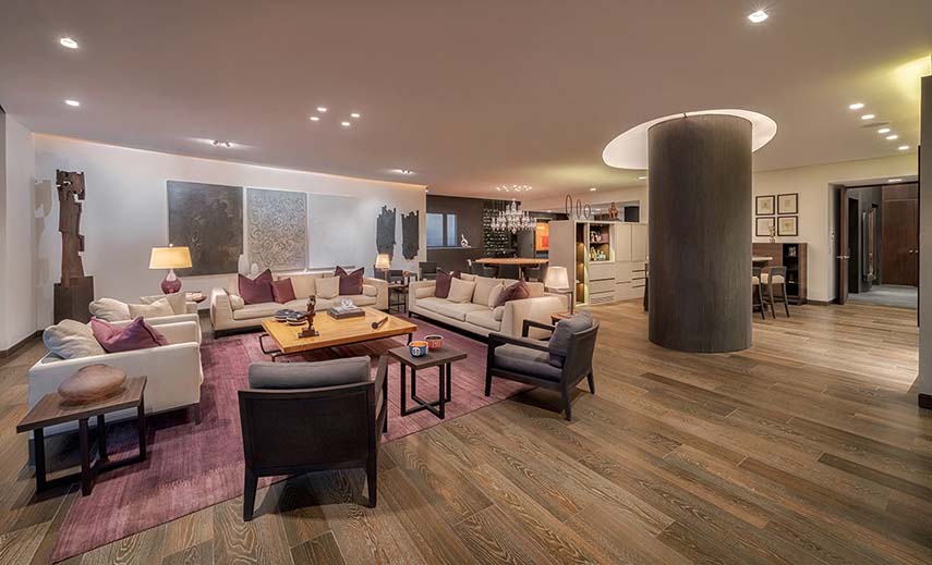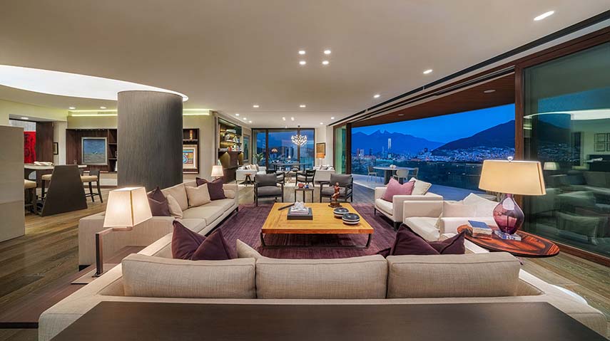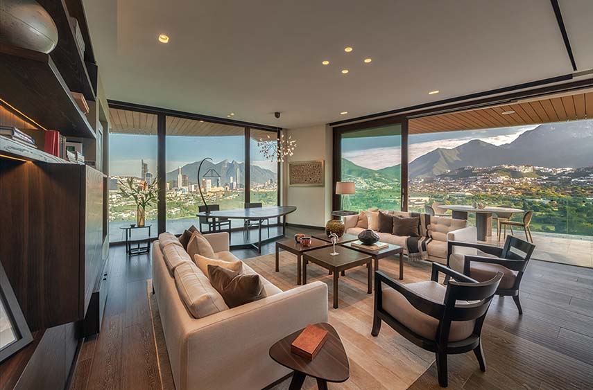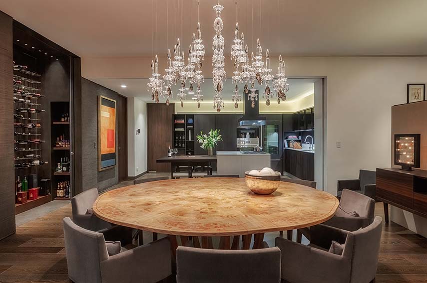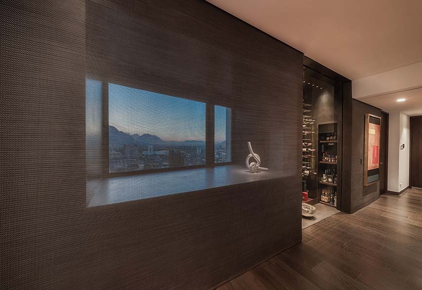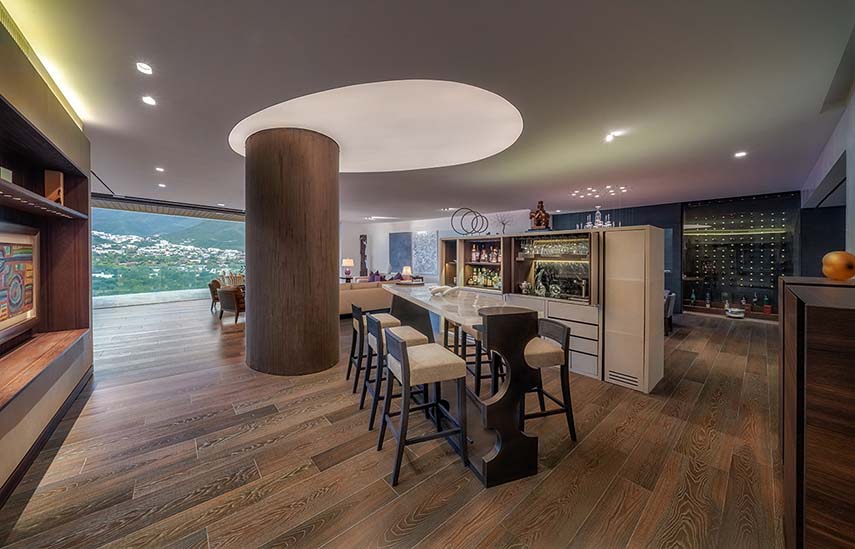 The Mexican studio López Duplan Arquitectos, expert in luxury residential interior design projects, completed in 2024 the Departamento R&J. An apartment rare in its kind: circular floor plan, more than generous square footage, and a breathtaking view. The design starts from the vertical distribution core that occupies the center of the space. The elevator block is clad in wood on two walls, where the doors leading to the various areas of the residence are hidden, and one in gray granite matching the floor