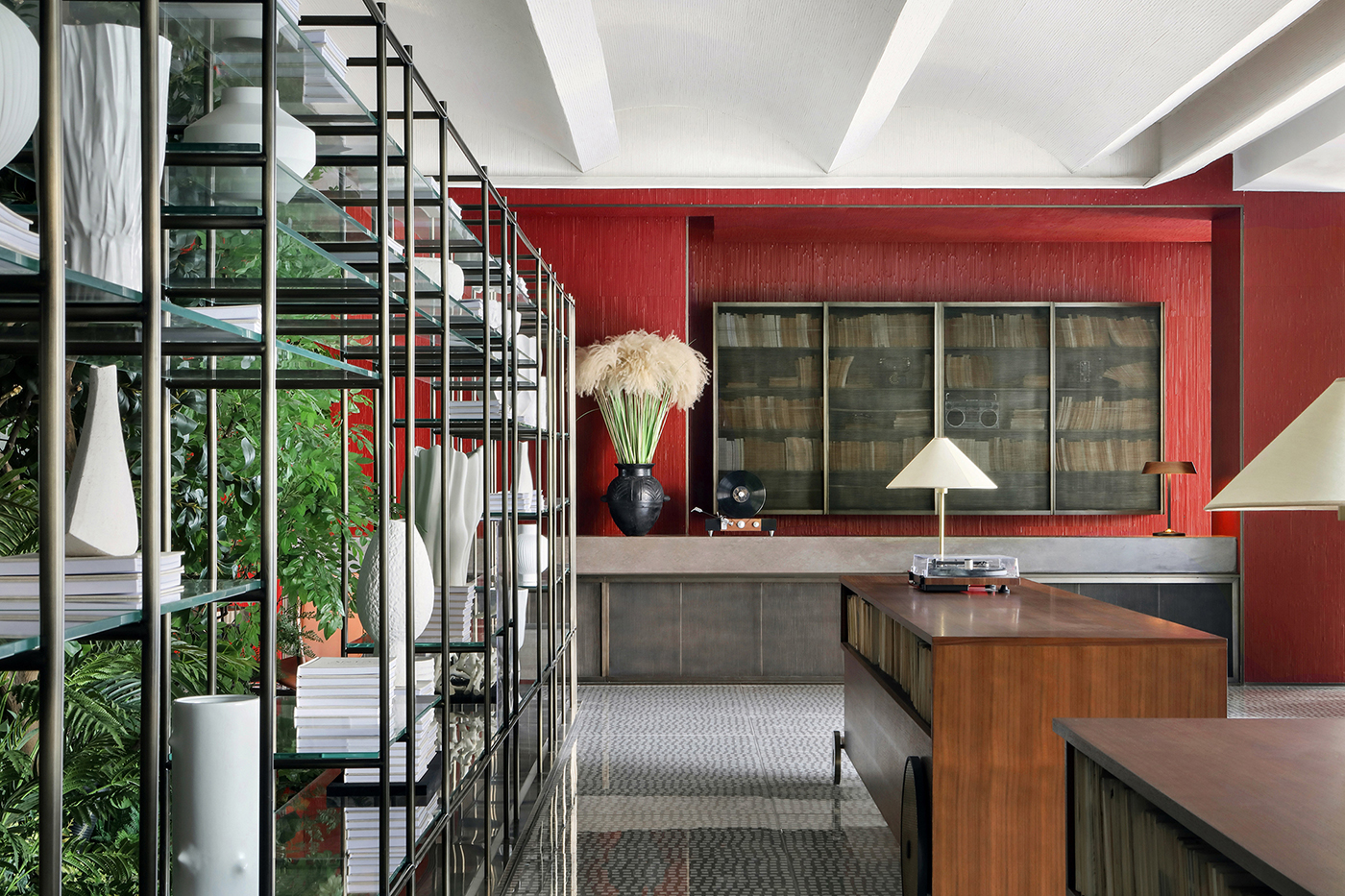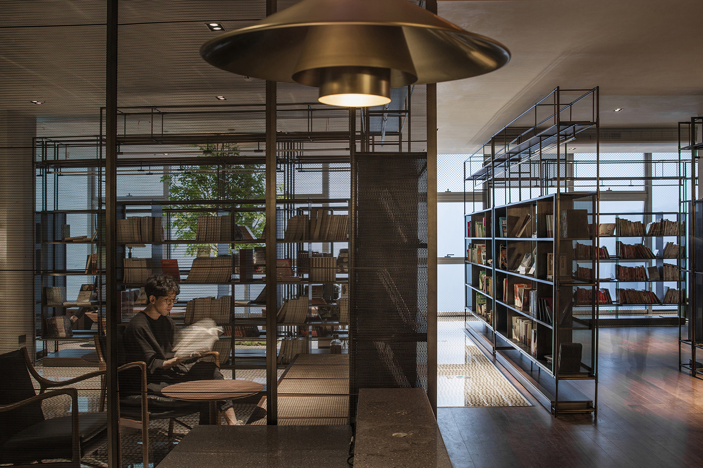 On the first floor, there is a cafeteria that connects the interior space with street activities. Behind the counter a layer of books and a layer of vegetation are interspersed in a miniature forest, breaking up the stereotypical image of a cafeteria or library