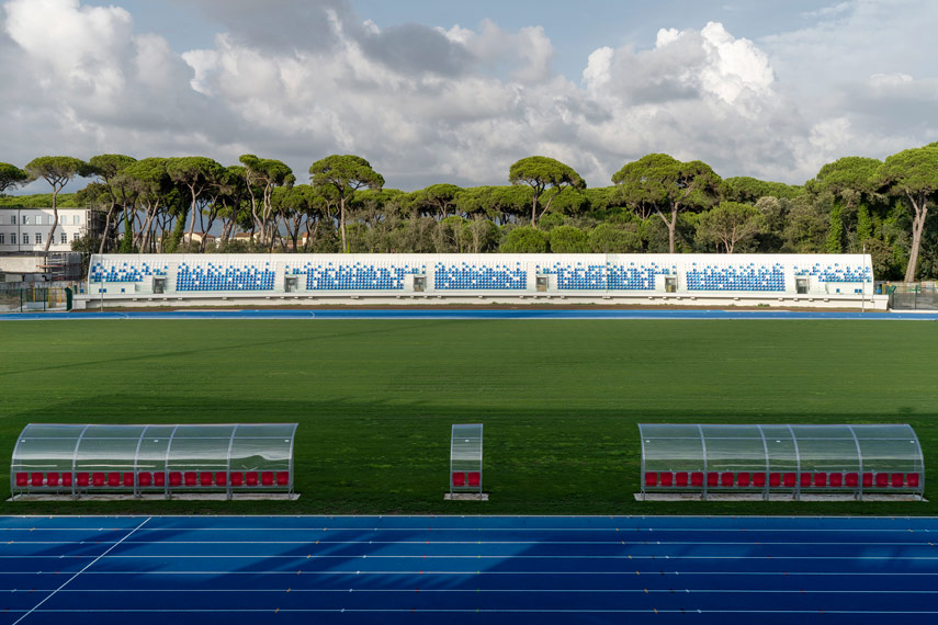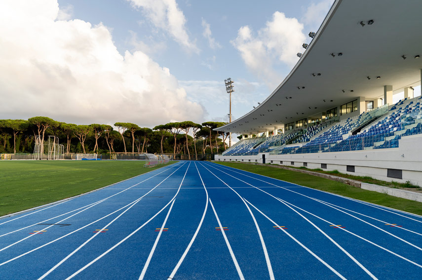The new Stadio dei Pini in Viareggio, designed and managed by Architect Giuseppe De Martino, Technical Director of Sportium, returns to the city a place full of sporting history, now completely renovated on a surface of 25,000 square meters. The project involved a comprehensive redevelopment of the facility, with 3,800 seats, a state-of-the-art athletics track, and reimagined services in a functional and accessible way. The result is a modern, high-performance complex capable of hosting national and international competitions, including the renowned Viareggio Cup.