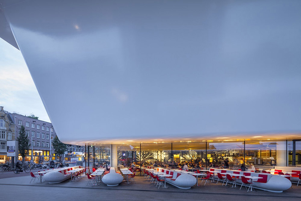 The entrance is moved to the Museumplein side and contributes to the new public quality of the square. The expansion sits above the entrance, and appears to be white, shiny and smooth with a shape that resembles a bathtub. A large canopy opens onto the square, creating a covered area that is part of both the building and the square