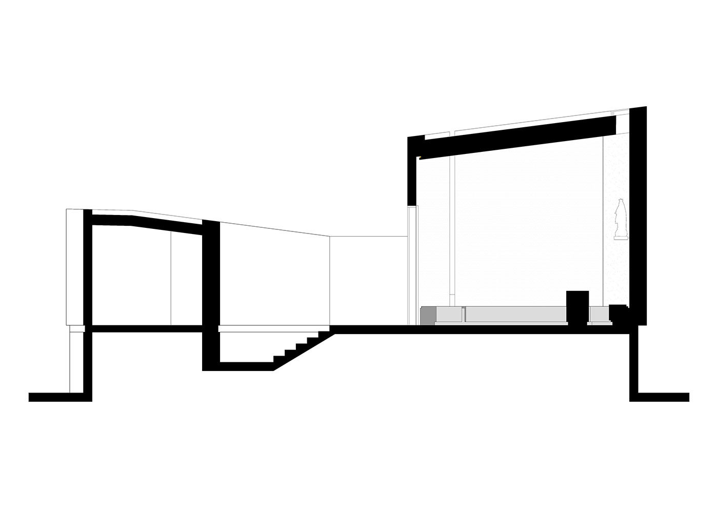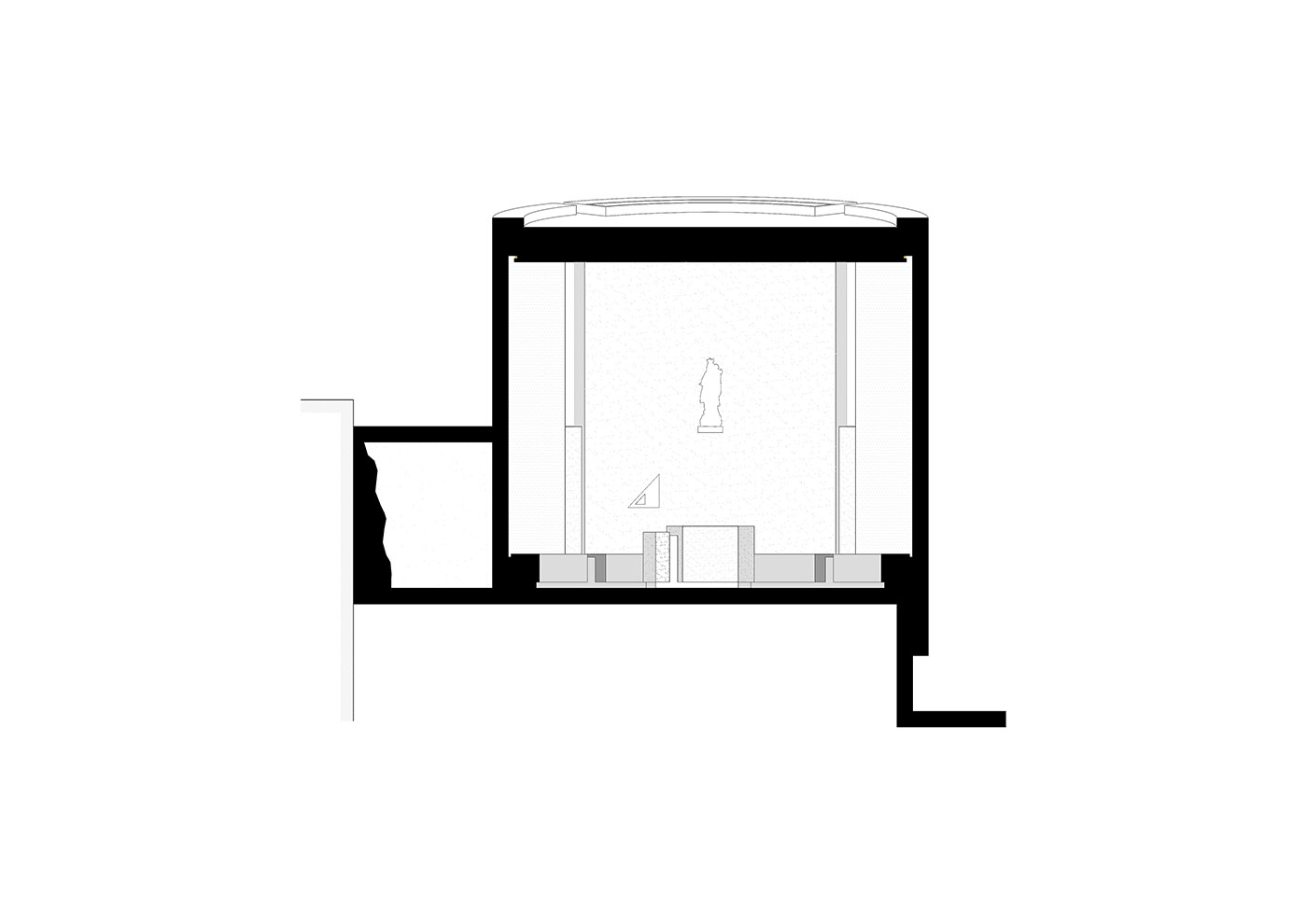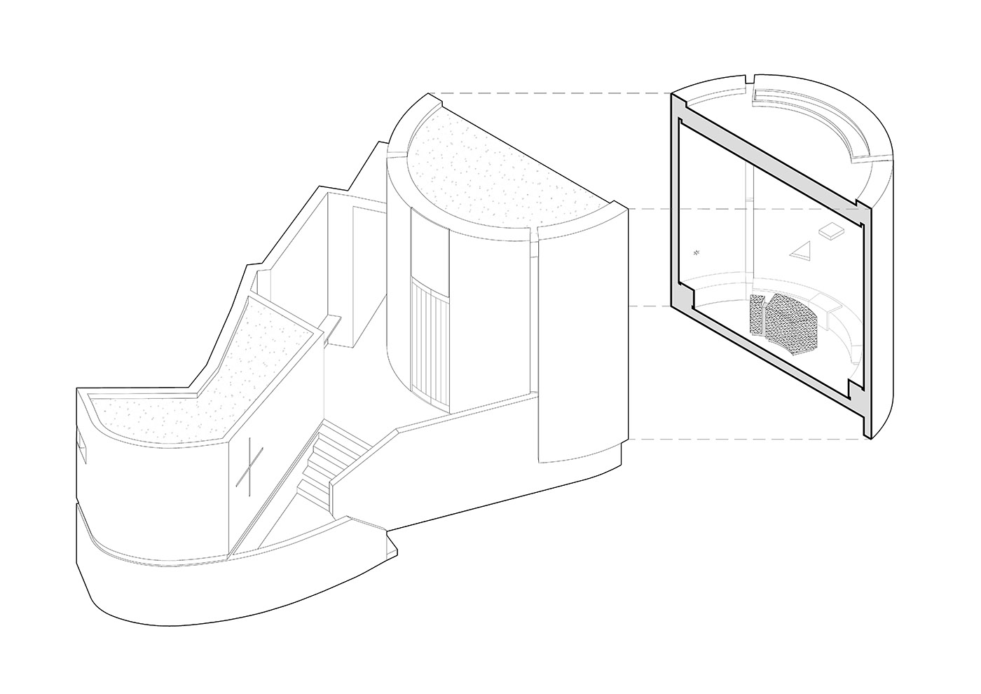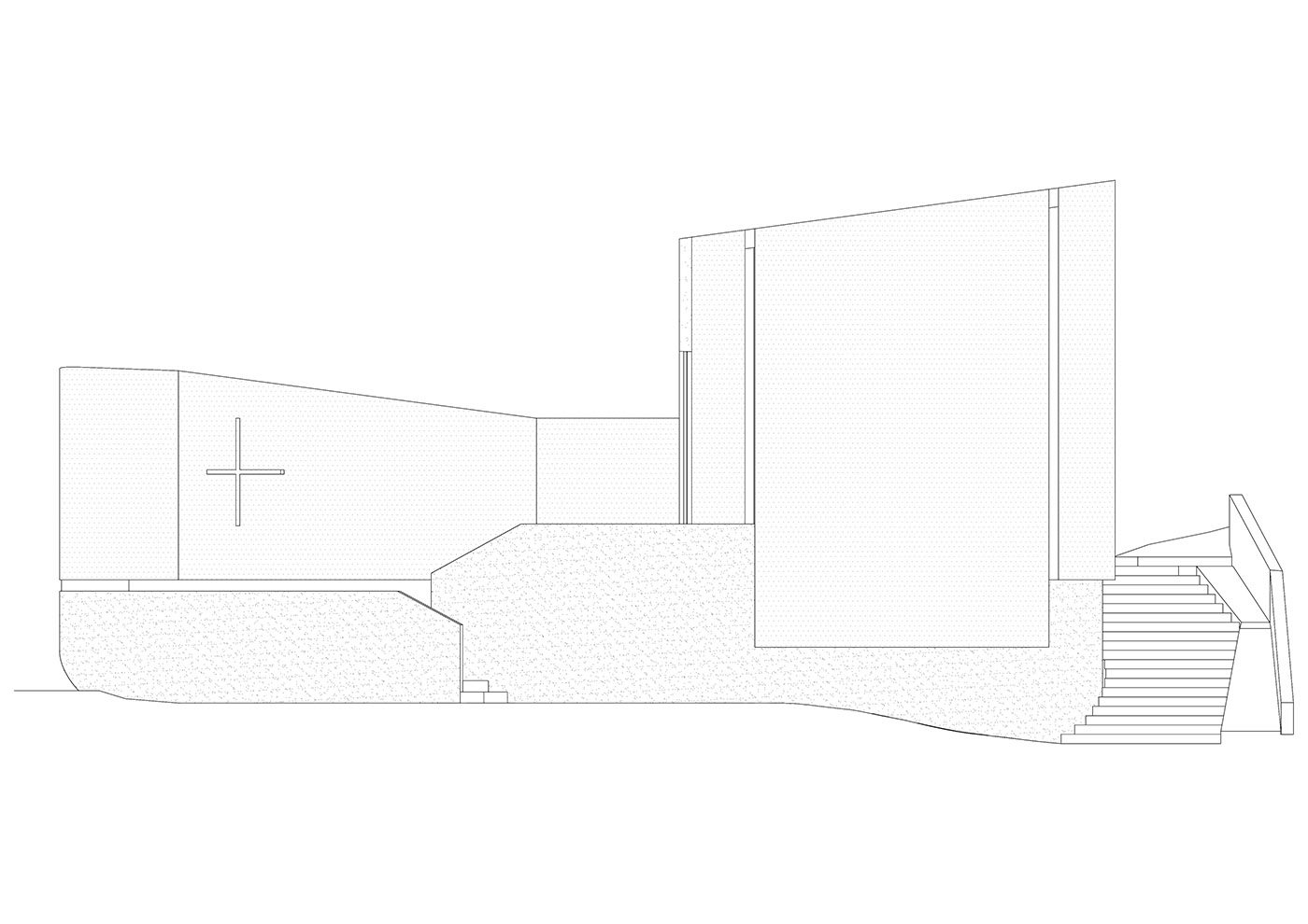 The chapel is designed as a single cylindrical volume, cut diagonally at its top. In this way, the interior space rises in height as one approaches the altar. Adjacent to the chapel is designed a small space for fishermen's prayer that resembles a cave, and a sacristy. The arrangement of volumes forms an open-air patio enclosed between buildings, protected from strong winds