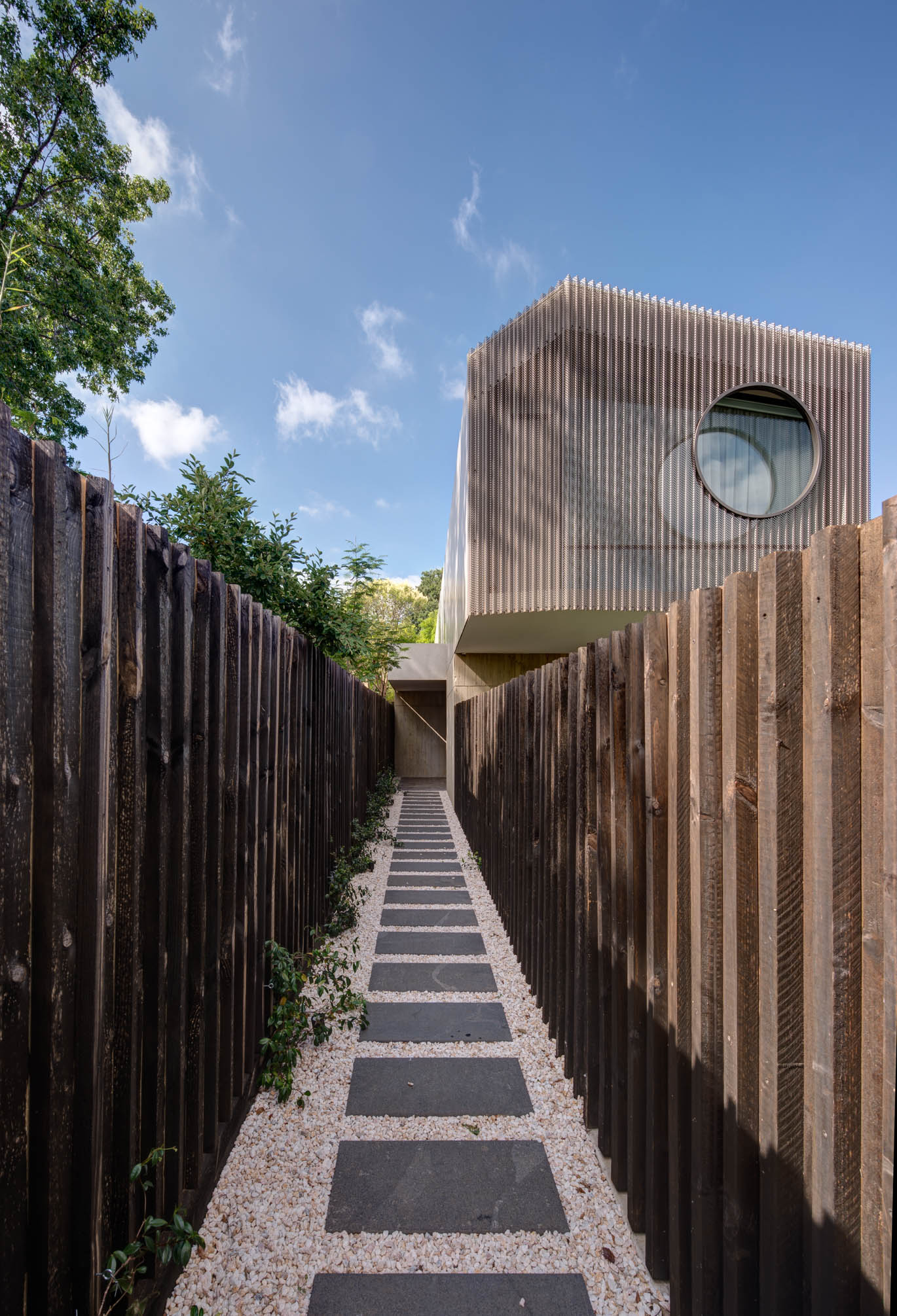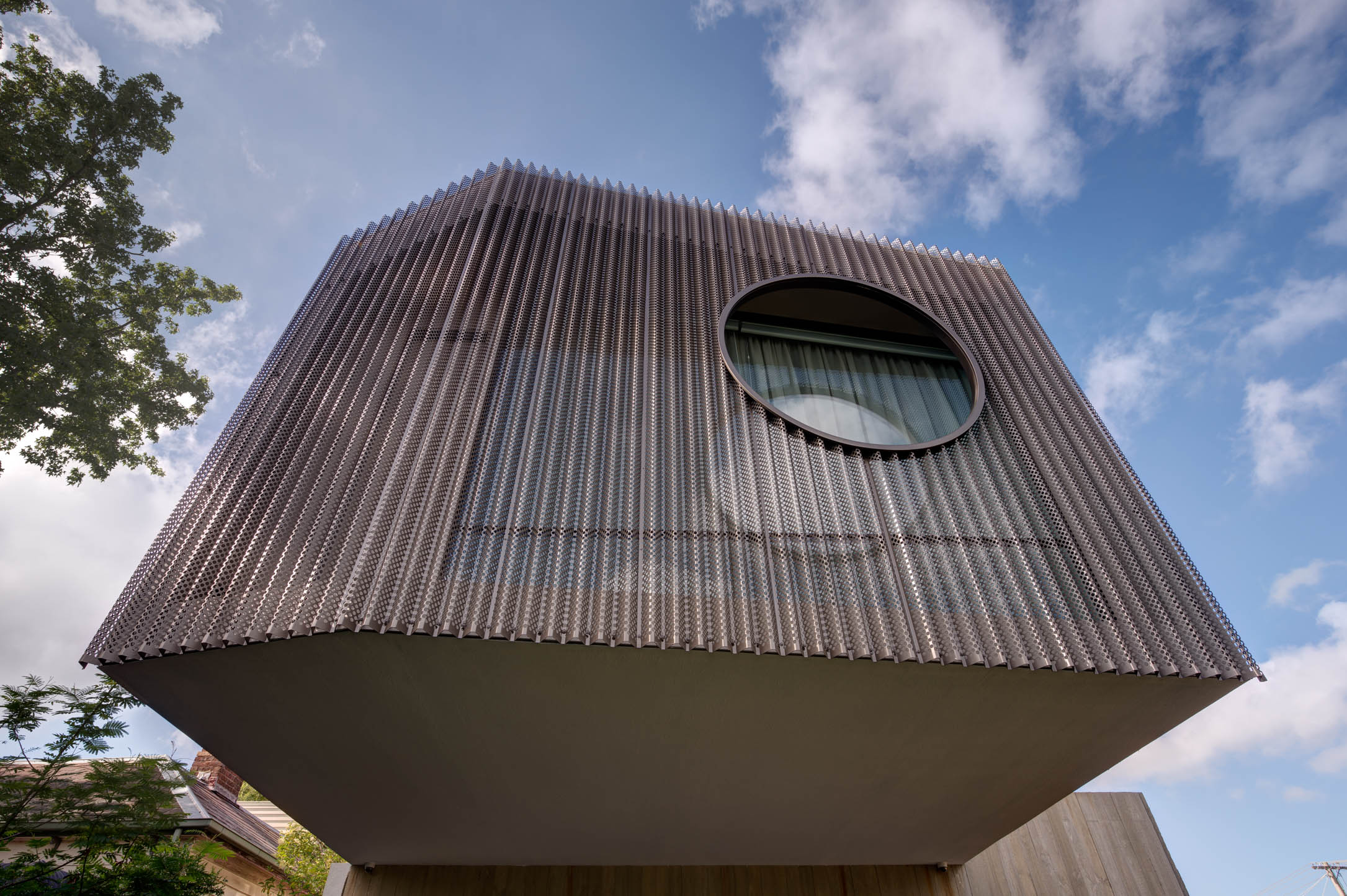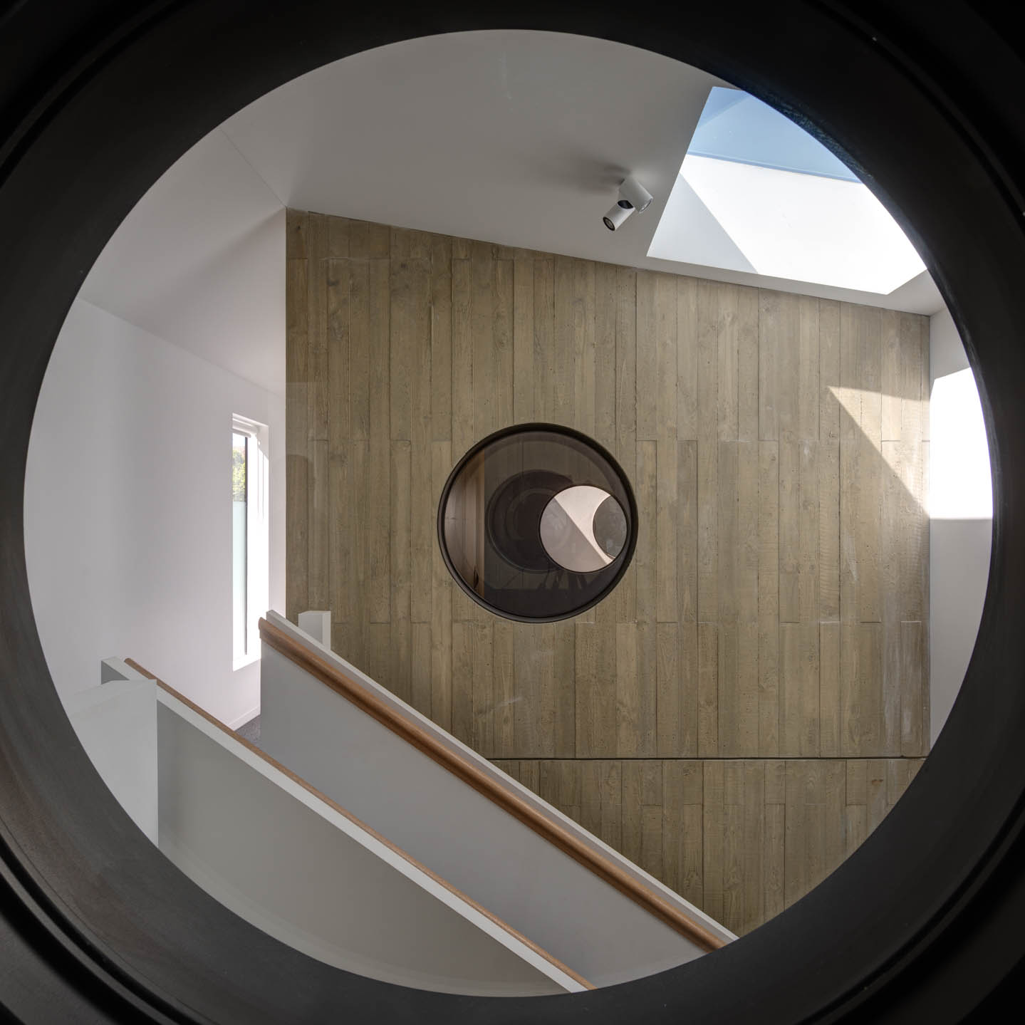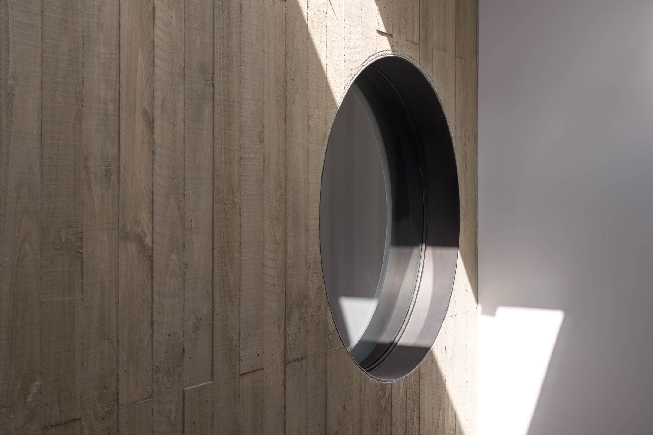 A deceptively large house seeks to increase its users' awareness of the environment: a series of cantilevered volumes and circular windows frame the outdoor spaces like magnifying glasses for an engaging interaction with nature