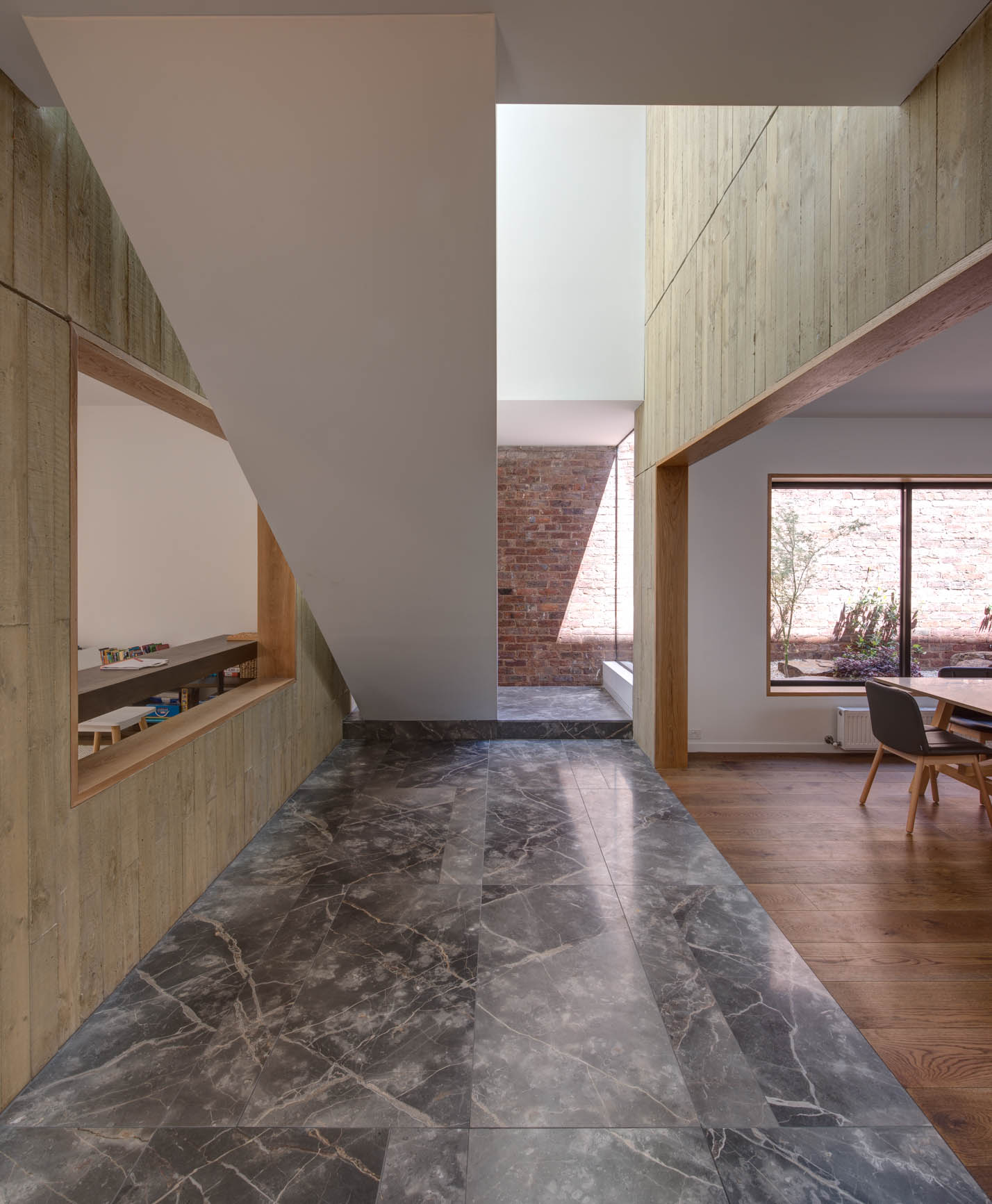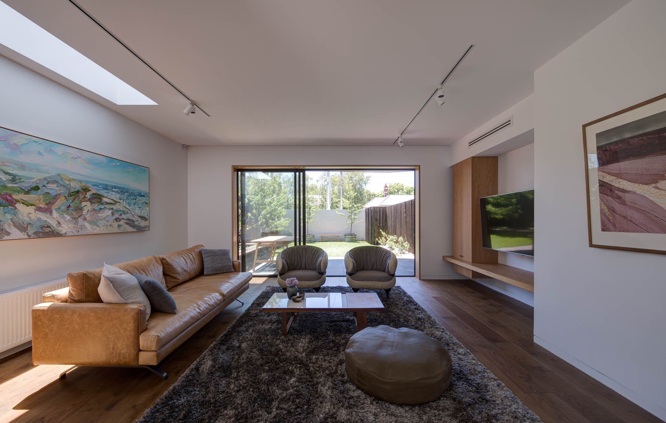 The brief for the project was to create a single north-facing space at the front of the property. The plan of the house is deep and narrow, but the distribution of space and precise architectural devices allow the space to feel much larger than it really is