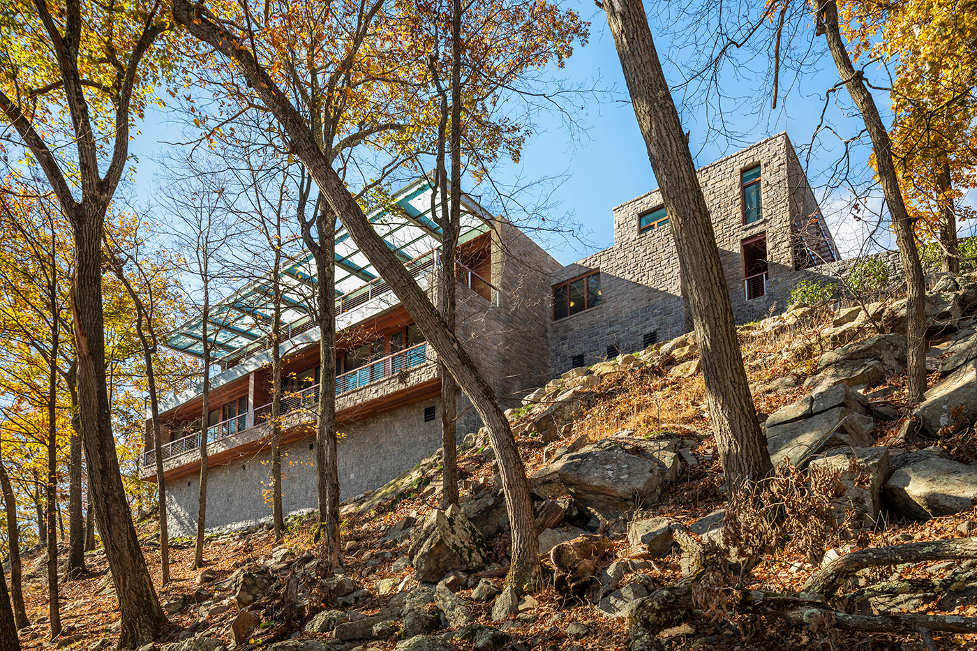 Set into the rock of the steeply sloping site, the Sterling Forest House blends into nature with its gray and salmon-colored granite cladding, green roof, and mahogany windows