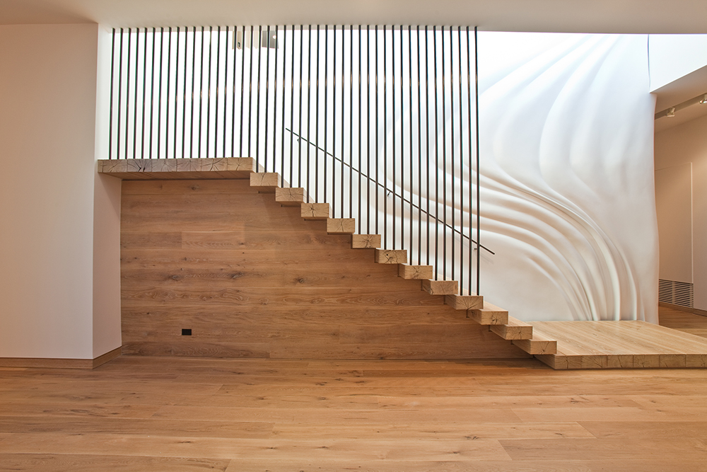 The interior spaces are characterized by wood and stone materials. The ground floor is connected with the upper floor by a sawn wood staircase, with a custom design, with a wall that is reminiscent of a fabric curtain