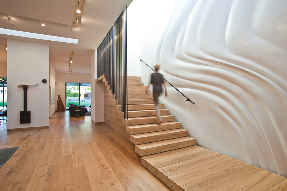 The Assembledge architecture studio renovates a villa perched in the hills of Bel Air, the Stoneridge Residence, skillfully integrating architecture and landscape with a large lawn and a monumental swimming pool, the focal element of the courtyard