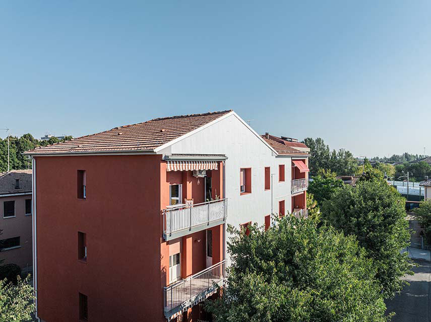 The requalification intervention of Condominio Alba B is carried out under the design of the Bologna-based studio CAT 24. Located in the residential area of San Giovanni in Persiceto in Bologna, the building originally had plastered facades and pitched roof. The modernization mainly involved the facades of the inhabited floors, which were transformed into ventilated facades