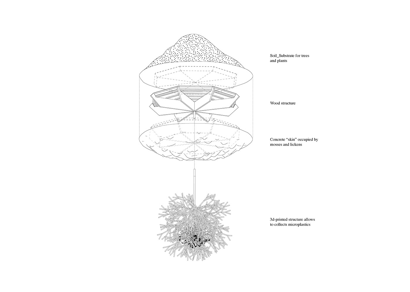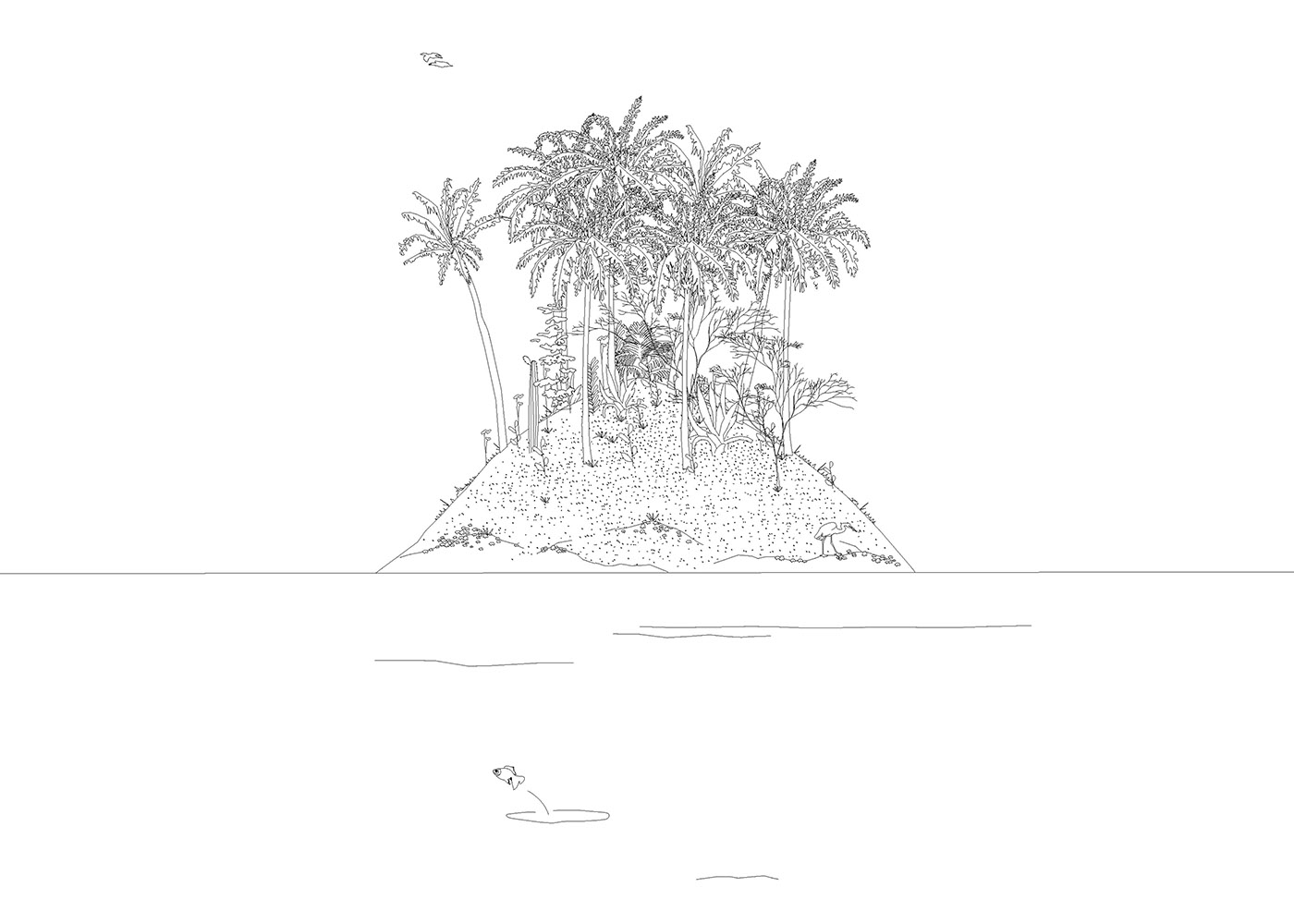 The prototype consists of two main parts. The first is the actual island, made with a wooden structure that contains soil and plants, particularly coconut palms and agave plants for their ability to withstand strong winds, providing habitat for various animal species. Underwater, the island features a topography of inverted hills with peaks and valleys of varying sizes, creating the perfect habitat for different types of invertebrates, mosses, and plants. This underwater landscape contributes to promoting biodiversity