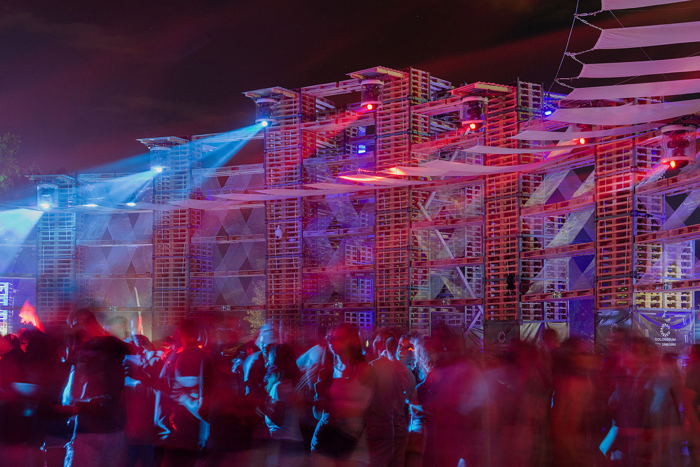 The first Colosseum at the Sziget Festival was built in 2012 with the idea of using pallets, which were inspired by the pallets used for the logistics that are usually found around large events. With this system, the modules of the structure do not need to be disposed of at the end of the show, nor do they need to be numbered for reuse. This highly successful experiment has created a new category of festival venue: an architecture that is both functional and spectacular, completely different from the usual structures