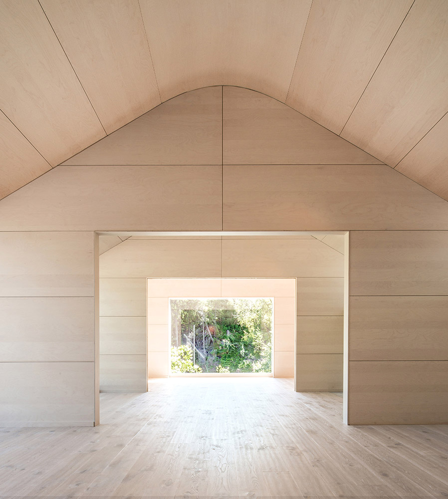 Le tre ali che compongono la casa creano due spazi esterni, ciascuno con un proprio carattere distinto. La logica della casa è creata da una costruzione a telaio in legno, sia pragmatica che costruttiva. Il compensato di betulla viene tagliato e montato in maniera sistematica. I telai generano diverse zone nell'open space