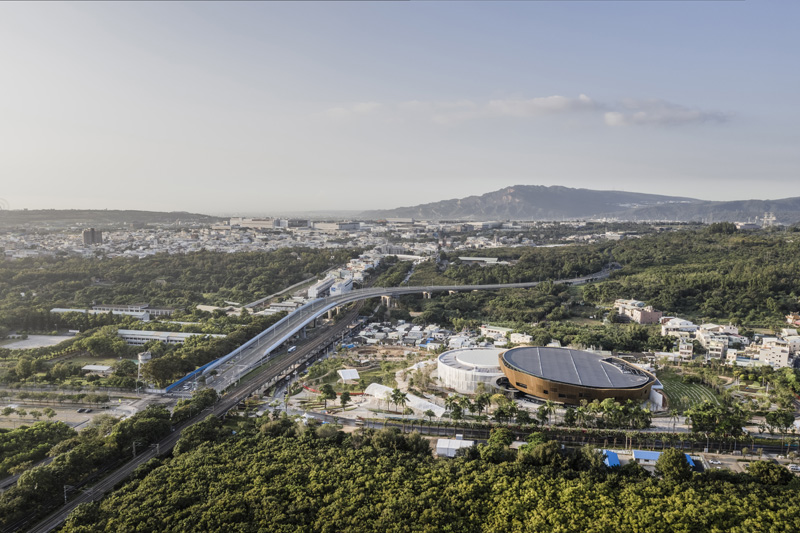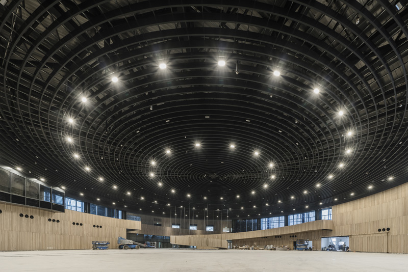 The structure is composed of two overlapping circular floors, reflecting the importance of the two main uses of the building, flexible exhibition spaces and an orchid greenhouse. Thanks to the use of contrasting materials, different lighting conditions, different heights and different openings, the two spaces assume distinct characters