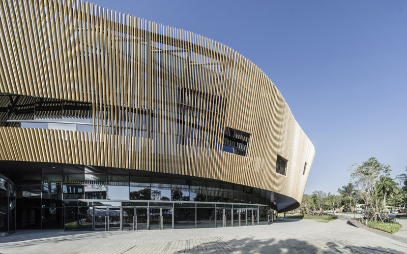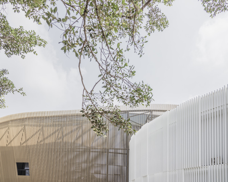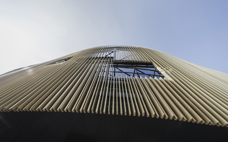 The cladding of the building is composed of vertical slats, from which the "flower" motif is derived. Although each slat is vertical, the upper part of the slats varies to create the sculpted curvature while the lower part maintains the positions to form a concentric circle corresponding to the circular plane of the building