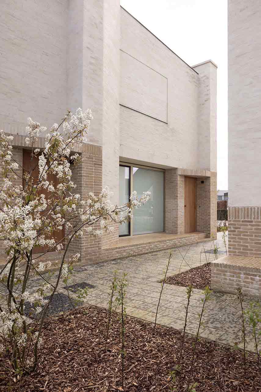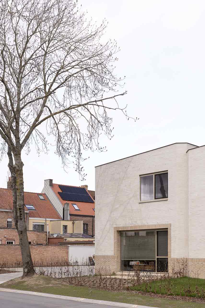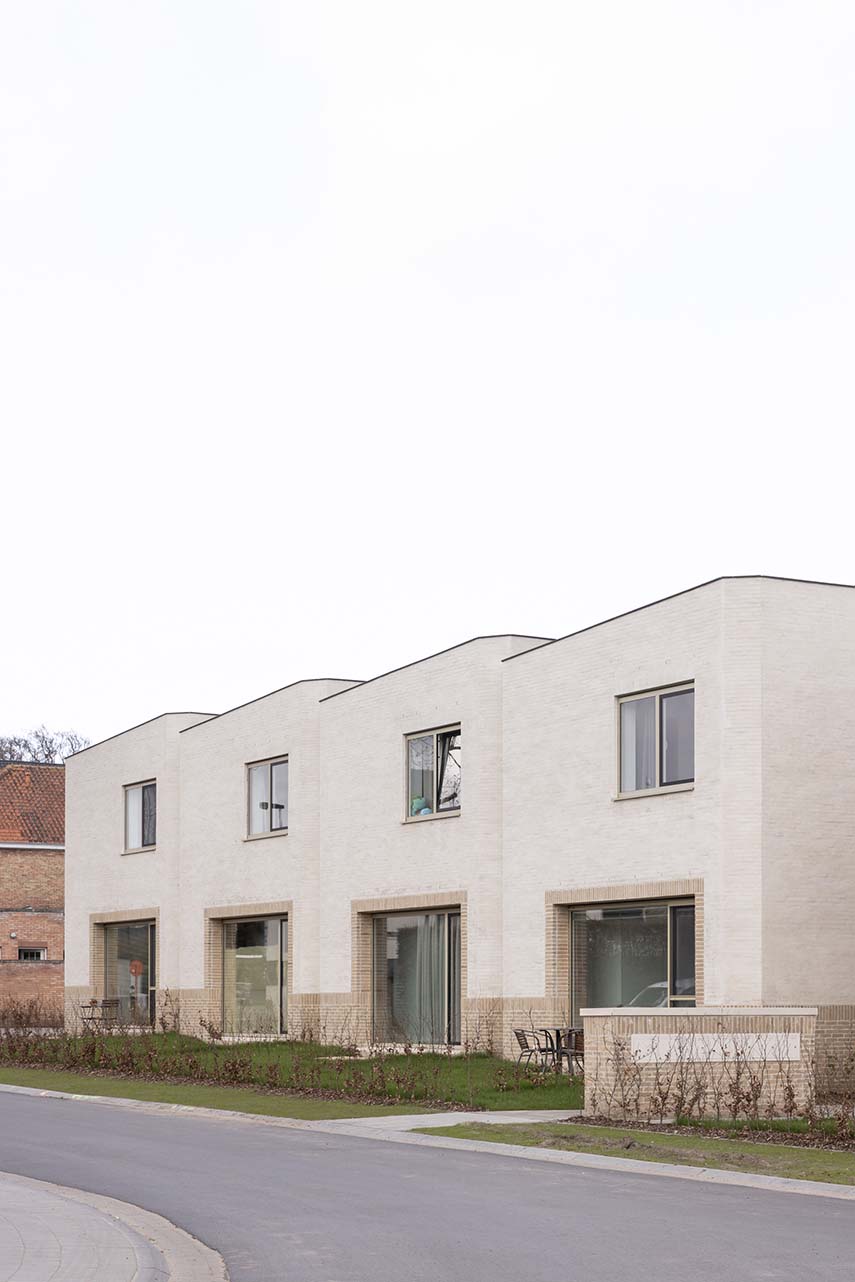 Ten Boomgaard, designed by WE-S architects, is located on a corner lot in Bruges, Belgium. Here, the Beguinage, settlements where religious women retired to live together, characterizes the urban fabric. In the same way, the seven new homes create a living space that lies between private and collective, recalling in the volumes that gather around a common outdoor space, the compositional and aesthetic characteristics
